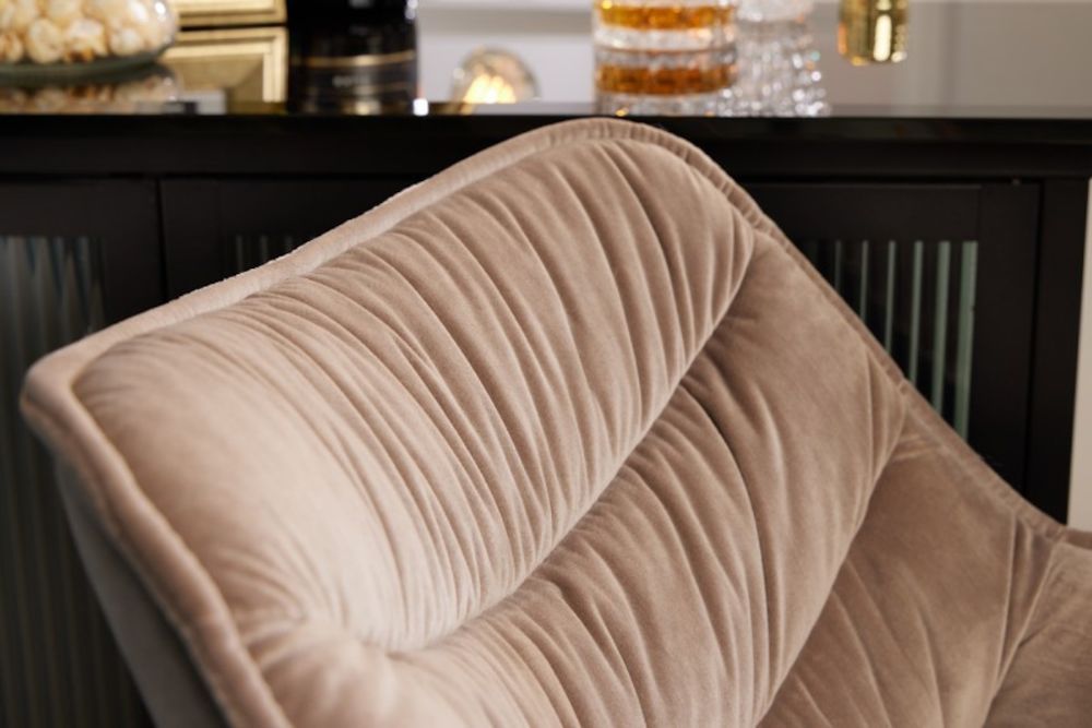 Presvlaka od mikrovlakana u bež boji, dok suptilni ukrasni šavovi dodaju dodatnu slojevitost i karakter ovom komadu namještaja. Mekana tekstura mikrovlakana daje ovoj stolici luksuzan, ali nepretenciozan izgled, dok kontrastna crna metalna baza osigurava stabilnost i čvrstoću.