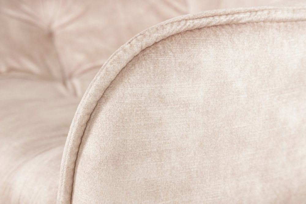 Sjedeći dio, dimenzija 37 cm u širinu, 75 cm u visinu i 38 cm u dubinu, obložen je baršunastom tkaninom u elegantnoj bež boji. Ovaj baršun, izrađen od 100% poliestera, pruža ne samo vizualnu privlačnost već i izvanrednu udobnost. Njegova tekstura je mekana na dodir, stvarajući osjećaj luksuza pri svakom sjedanju. Naslon za leđa, visok 36 cm, i nasloni za ruke, visoki 13 cm, oblikovani su tako da pružaju dodatnu podršku i udobnost, čineći ovu stolicu savršenim mjestom za opuštanje uz čašu pića ili obrok.