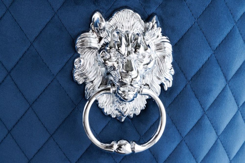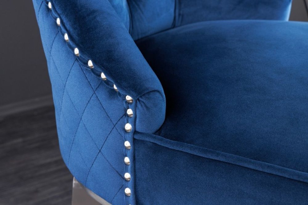 Jedan od istaknutih detalja ove stolice su ukrasni gumbi i šavovi koji stvaraju vizualnu slojevitost i bogatstvo. Posebno dizajniran komforni rukohvat na stražnjoj strani stolice ne samo da olakšava njeno pomicanje, već dodaje i dodatni sloj luksuza. Srebrni detalji, uključujući metalne noge i ukrasne gumbe, savršeno se slažu s mekanom plavom baršunastom presvlakom, stvarajući harmoniju između hladnih metalnih tonova i topline tkanine.