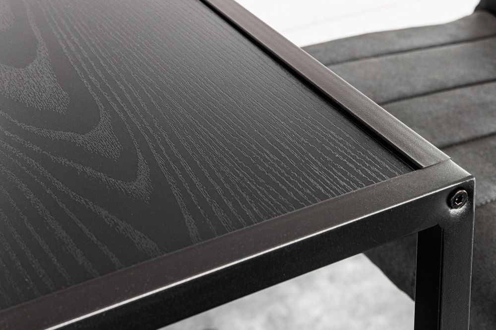 Metalni okvir, također u crnoj boji i premazan prahom, pruža stabilnost i snagu, istovremeno dodajući industrijski dodir koji je u skladu s modernim trendovima. Razmak između nogu stola iznosi 116 cm, pružajući dovoljno prostora za udobnost i jednostavno kretanje, dok razmak između poda i rubova stola od 103 cm omogućava lako sjedenje i kretanje ispod stola.
