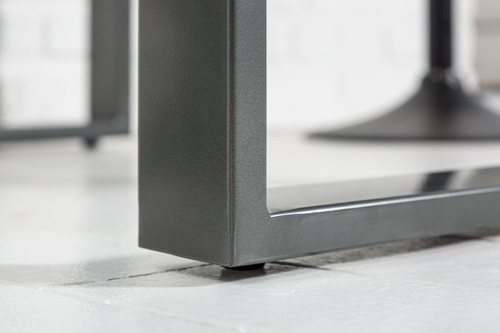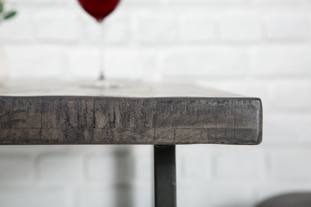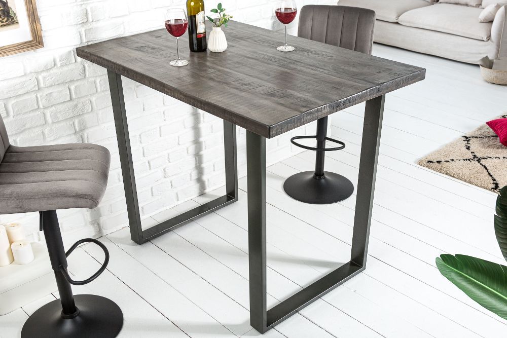 "U svijetu gdje se industrijski dizajn i prirodna elegancija spajaju, barski stol postaje umjetnički manifest dualnosti modernog doba. Ovaj stol, s pločom izrađenom od masivnog drveta manga, odiše rustičnim šarmom i čvrstoćom. Površina stola, obogaćena izgledom dasaka, prenosi priču o svojoj postojanosti i izdržljivosti, dok suptilne nepravilnosti drvene teksture naglašavaju njegov autentični karakter. Podnožje stola, izrađeno od crnog, plastificiranog željeza, dodatno ističe industrijski stil. Ujedno robustno i elegantno, ovo postolje stvara kontrast s toplinom drvene ploče, čime se naglašava sklad između prirode i ljudske ruke. Čiste linije i geometrijska jednostavnost podnožja pridonose modernom izgledu, dok njegova funkcionalnost ostaje neupitna. Dimenzije stola (120cm x 105cm x 80cm) osiguravaju dovoljno prostora za društvena okupljanja, dok debljina ploče od 40mm pruža osjećaj stabilnosti i trajnosti. Noge stola, s dimenzijama 7cm x 2cm, diskretno ali čvrsto podupiru cijelu strukturu, omogućujući dugovječnost ovog komada namještaja. Materijali od kojih je stol izrađen, kombinacija masivnog, lakiranog drveta manga i praškasto premazanog željeza, predstavljaju spoj prirodnih elemenata i suvremenih tehnologija obrade. Siva boja, koja dominira ovim komadom, unosi notu sofisticiranosti, dok ujedno ostavlja prostora za razne kombinacije s drugim dekorativnim elementima. "