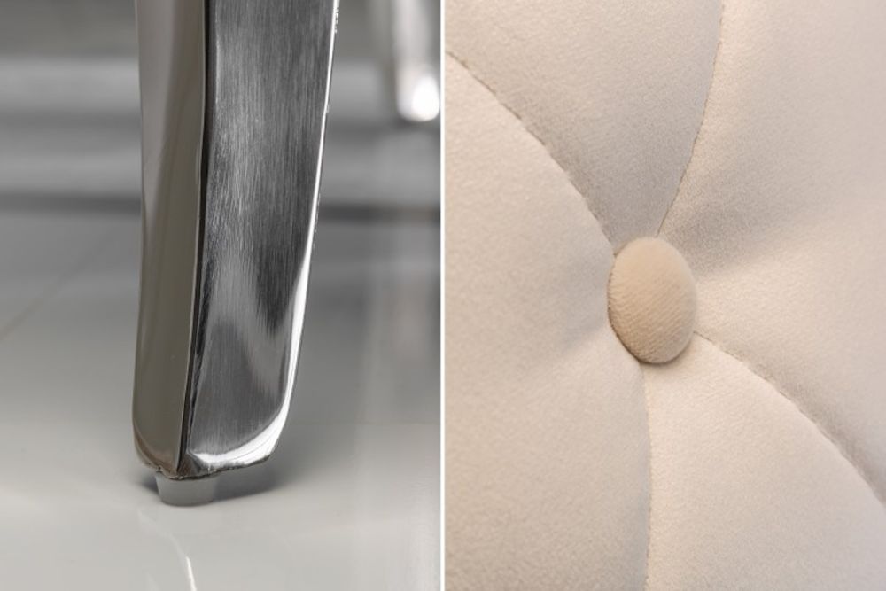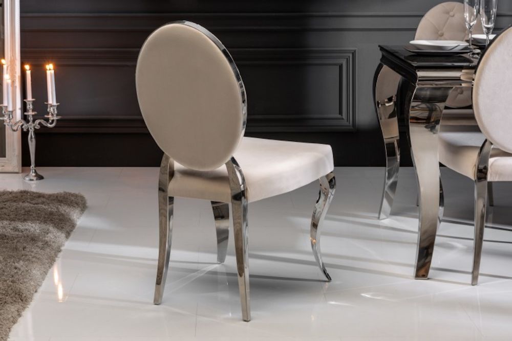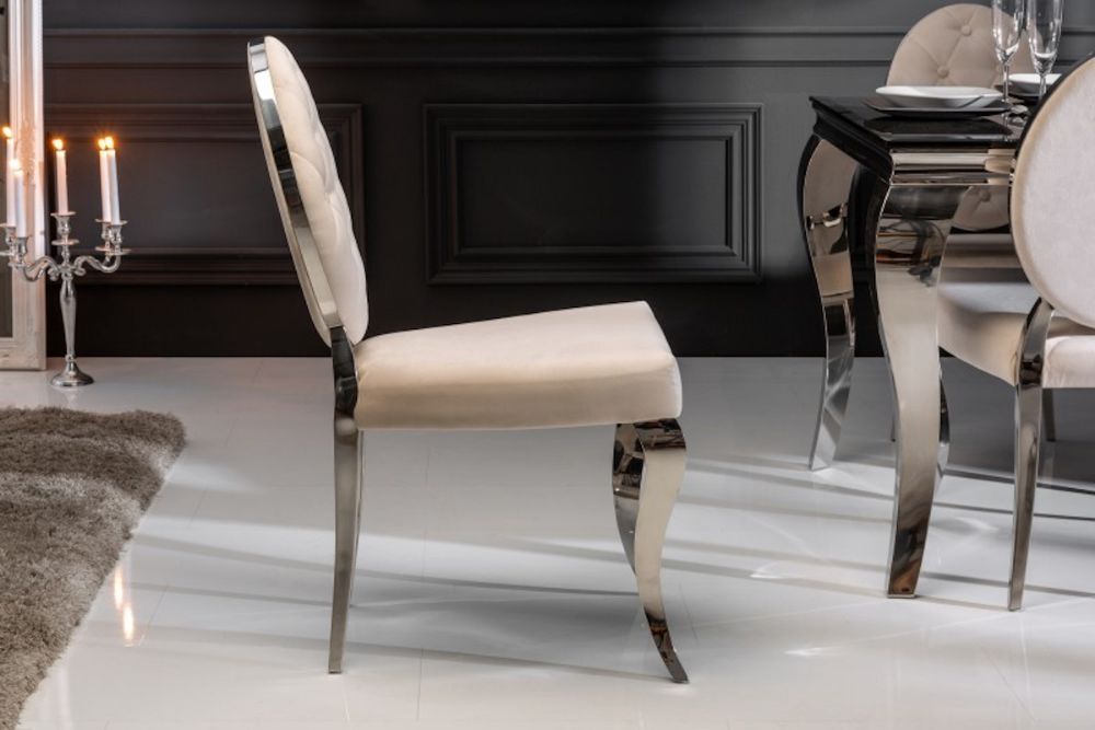 Ova stolica predstavlja savršeni spoj raskoši baroknog stila i modernih linija, stvarajući komad namještaja koji istovremeno zrači elegancijom i suvremenom udobnošću. Presvučen baršunom u nježnoj bež nijansi, stolac nudi neodoljivu mekoću i luksuzan osjećaj, dok njegov ergonomski oblik pruža udobnost koja nadmašuje očekivanja. Dekorativni detalji na naslonu i pažljivo oblikovane noge podsjećaju na bogatu estetsku tradiciju baroka, no s modernim minimalizmom koji ga čini idealnim za suvremene interijere. Čvrsta konstrukcija i profinjeni materijali osiguravaju dugotrajnu upotrebu, dok njegova bezvremenska ljepota podiže svaki prostor – od blagovaonice do salona – na novu razinu sofisticiranosti.