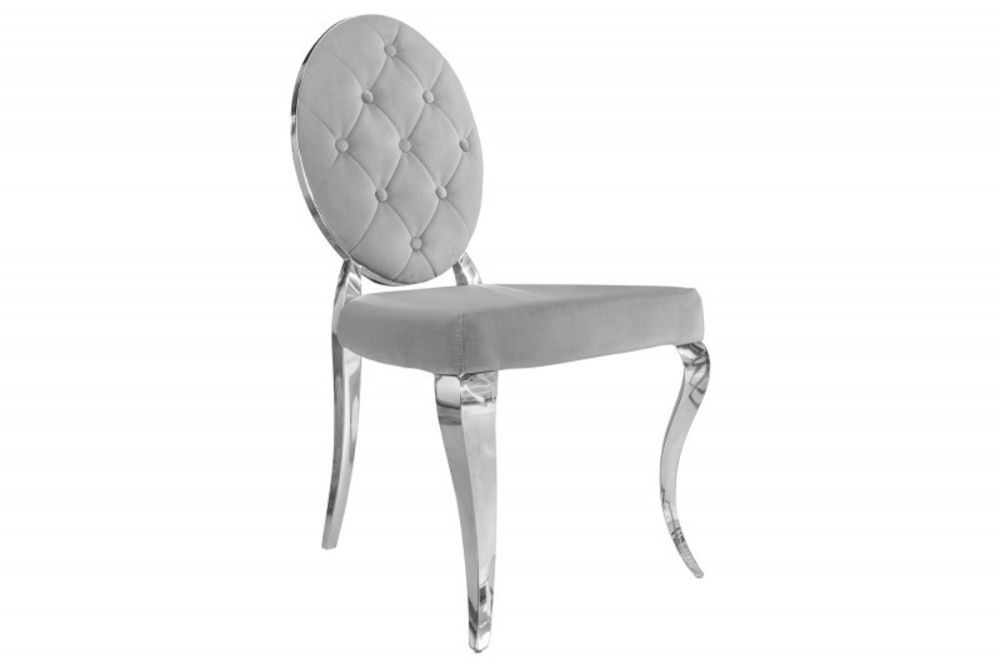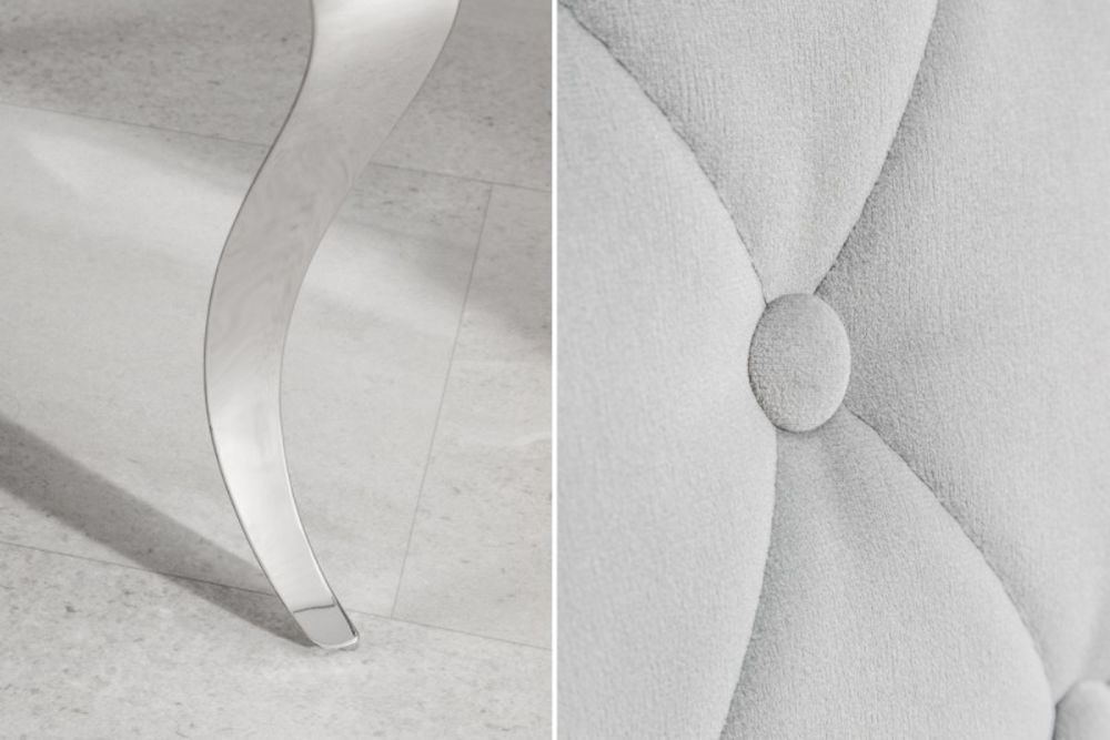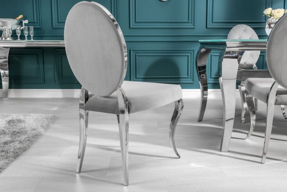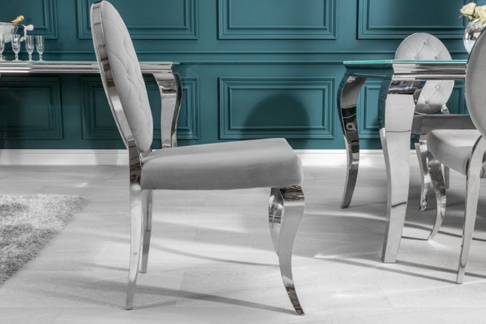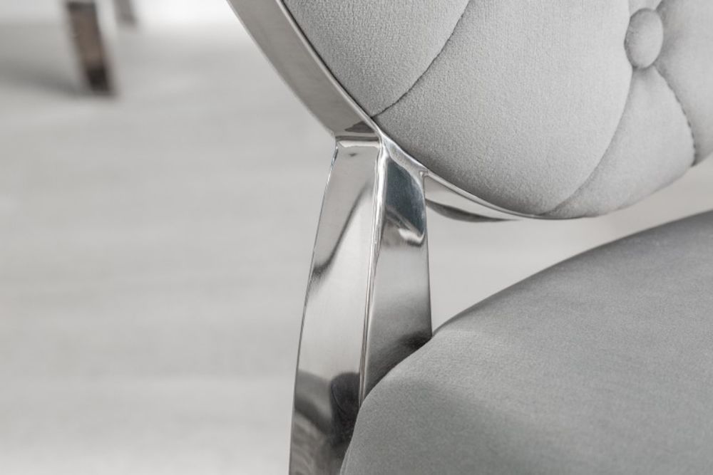 Ova stolica predstavlja savršeni spoj raskoši baroknog stila i modernih linija, stvarajući komad namještaja koji istovremeno zrači elegancijom i suvremenom udobnošću. Presvučen baršunom u nježnoj sivoj nijansi, stolac nudi neodoljivu mekoću i luksuzan osjećaj, dok njegov ergonomski oblik pruža udobnost koja nadmašuje očekivanja. Dekorativni detalji na naslonu i pažljivo oblikovane noge podsjećaju na bogatu estetsku tradiciju baroka, no s modernim minimalizmom koji ga čini idealnim za suvremene interijere. Čvrsta konstrukcija i profinjeni materijali osiguravaju dugotrajnu upotrebu, dok njegova bezvremenska ljepota podiže svaki prostor – od blagovaonice do salona – na novu razinu sofisticiranosti.
