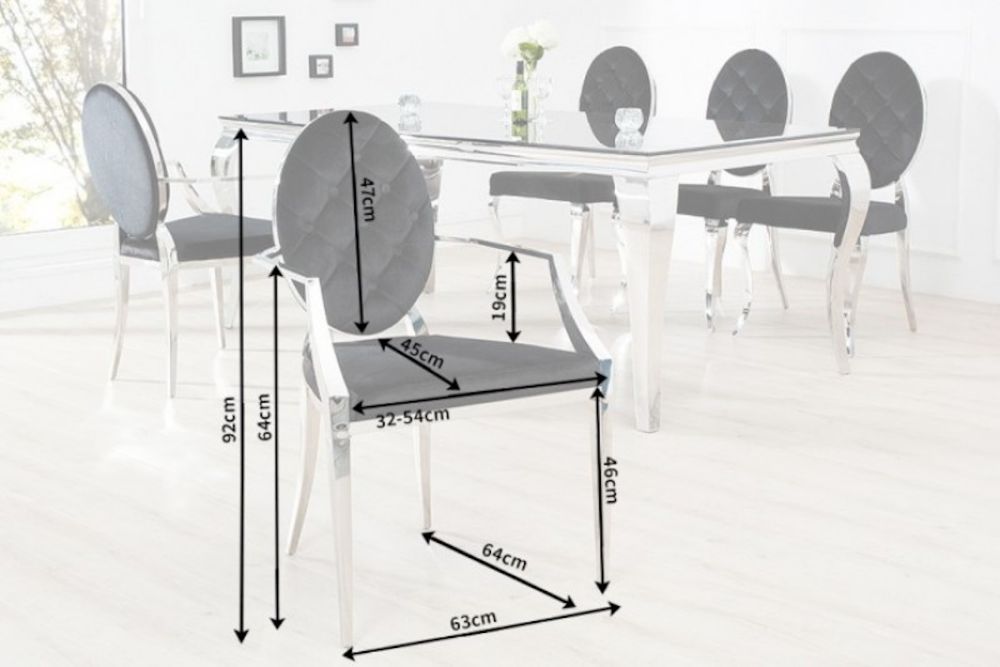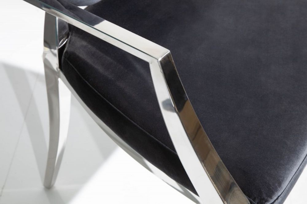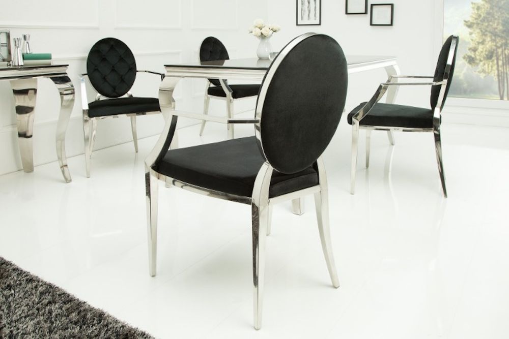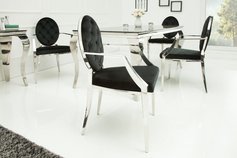 Ova stolica predstavlja savršeni spoj raskoši baroknog stila i modernih linija, stvarajući komad namještaja koji istovremeno zrači elegancijom i suvremenom udobnošću. Presvučen baršunom u crnoj boji, stolac nudi neodoljivu mekoću i luksuzan osjećaj, dok njegov ergonomski oblik pruža udobnost koja nadmašuje očekivanja. Dekorativni detalji na naslonu i pažljivo oblikovane noge podsjećaju na bogatu estetsku tradiciju baroka, no s modernim minimalizmom koji ga čini idealnim za suvremene interijere. Čvrsta konstrukcija i profinjeni materijali osiguravaju dugotrajnu upotrebu, dok njegova bezvremenska ljepota podiže svaki prostor – od blagovaonice do salona – na novu razinu sofisticiranosti.