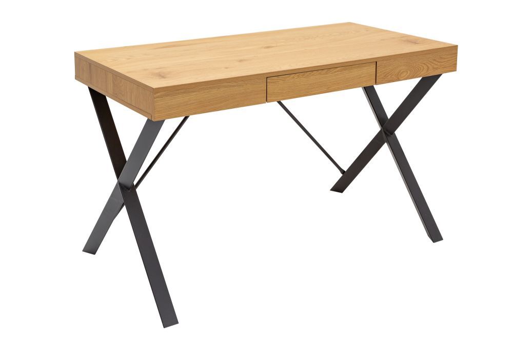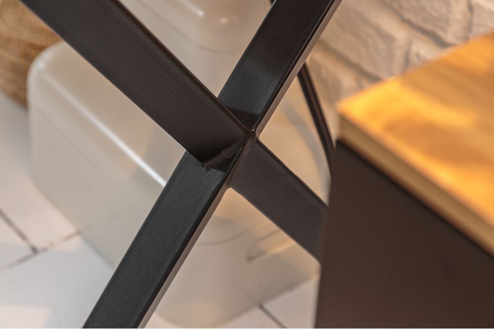Ovaj stolić, savršeno ukomponiran u industrijski stil, utjelovljuje spoj modernog minimalizma i sirove funkcionalnosti. Skladne linije tamnog metalnog okvira, plastificiranog za dodatnu izdržljivost, donose osjećaj postojanosti i stabilnosti. Metalne noge, prekrižene u elegantnom "X" obliku, podsjećaju na čvrste temelje industrijskih konstrukcija, dok topli tonovi prirodnog hrasta na ploči stola pružaju ugodnu kontrastnu notu i dojam bliskosti s prirodom.