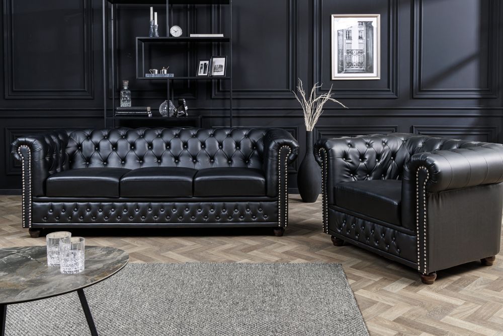 Ukrasni čavlići u srebrnoj boji dodatno naglašavaju Chesterfield inspiraciju, odajući počast tradiciji i vještini izrade. Antikni izgled ove fotelje poziva na povratak u prošlost, kao da je svakim detaljem oblikovana da bi u domu stvorila atmosferu elegancije koja nikada ne izlazi iz mode. Jedinstven spoj modernih materijala i klasičnih detalja čini ovu fotelju ne samo komadom namještaja, već pravim umjetničkim djelom, simbolom stila i trajne ljepote.