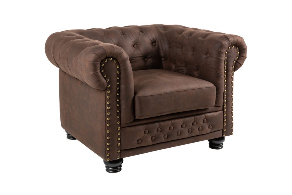 Ova fotelja, u elegantnom Chesterfield stilu, kao da dolazi iz druge epohe, noseći sa sobom duh klasike i beskompromisne elegancije. Sa svojim dimenzijama od 110 cm širine, 72 cm visine i 87 cm dubine, fotelja je utjelovljenje prostrane udobnosti i plemenitog stava, ostavljajući dojam veličine u svakom prostoru.