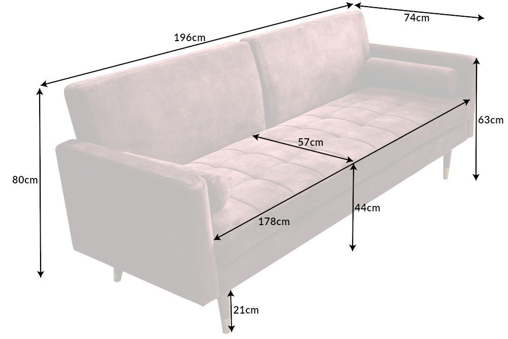 Dimenzijama od 196 cm širine, 80 cm visine i 74 cm dubine, savršeno se uklapa u dnevne sobe koje traže spoj funkcionalnosti i estetike. Površina za sjedenje pruža dovoljno prostora za dvoje, dok se spuštanjem naslona pretvara u udobno mjesto za ležanje dimenzija 178 cm x 106 cm.