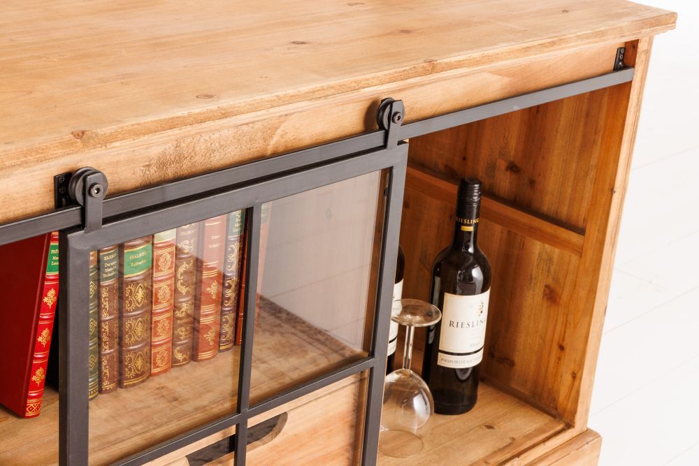 Komoda se ističe modernim i minimalističkim dizajnom, dimenzija približno 160 cm u širinu, 62 cm u visinu i 45 cm u dubinu. Korpus, izrađen od prirodnog bora, ima toplu svijetlu boju koja naglašava njegovu prirodnu ljepotu. Površina je glatka i čista, stvarajući elegantan izgled. Klizna vrata u elegantnoj crnoj boji dodaju snažan kontrast s drvenim korpusom, dok istovremeno pružaju modernu notu cijelom komadu. Kada se vrata otvore, otkriva se prostrani otvoreni odjeljak dimenzija 75 cm u širinu, 24 cm u visinu i 41 cm u dubinu, savršen za izlaganje dekorativnih predmeta ili knjiga. U donjem dijelu ormarića nalaze se dvije ladice dimenzija 35 cm x 19 cm x 35 cm, idealne za pohranu sitnica, dok dva zatvorena odjeljka dimenzija 36 cm x 46 cm x 41 cm omogućuju uredno skladištenje stvari izvan pogleda. Noge ormarića visine 3,5 cm pružaju stabilnost i lagan izgled, dok njihova diskretna prisutnost stvara dojam da ormarić lebdi iznad poda. Ovaj ormarić savršeno spaja funkcionalnost i stil, čineći ga idealnim dodatkom za svaki prostor, s kombinacijom prirodnih i modernih elemenata koji će se uklopiti u razne interijere.