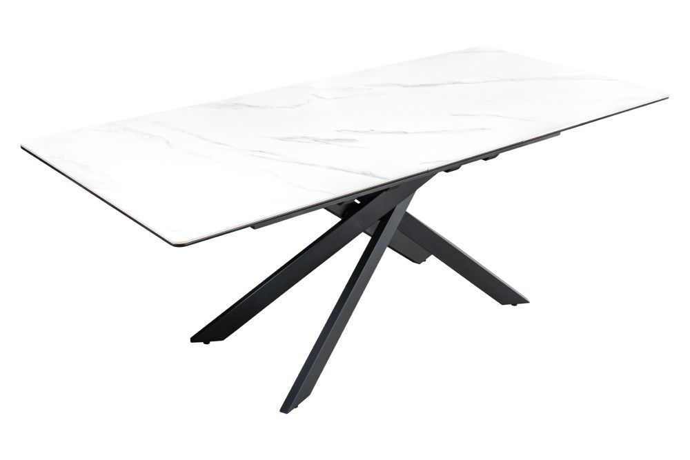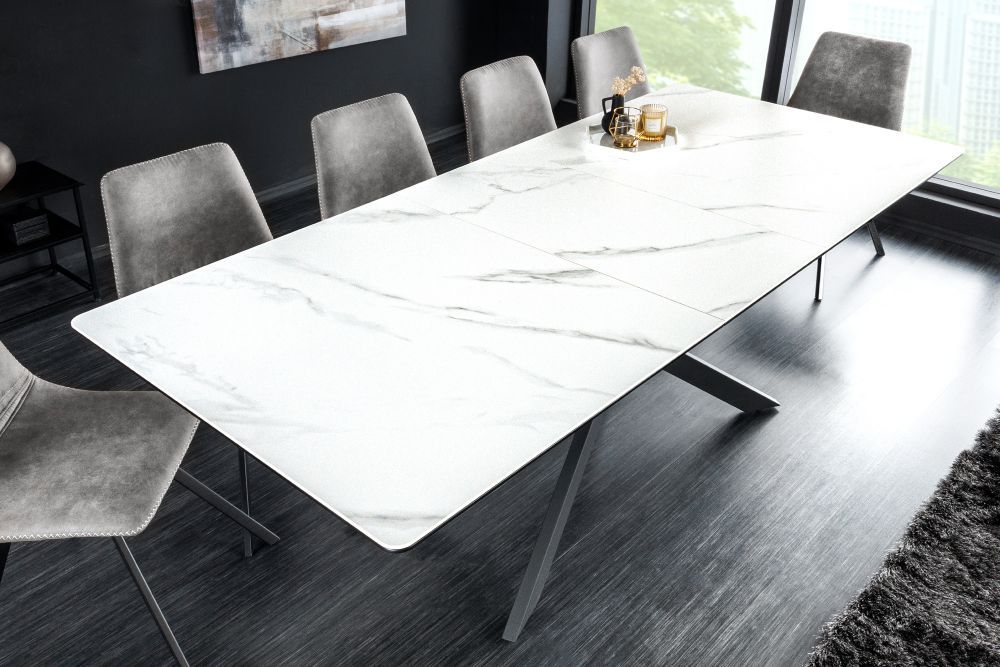 Ovaj impresivan kuhinjski stol savršeno kombinira funkcionalnost i moderni industrijski dizajn. Njegova gornja ploča, dimenzija od 160 do 200 cm u širini, 76 cm u visini i 89,5 cm u dubini, izrađena je od lakirane MDF ploče s keramičkom površinom koja imitira bijeli mramor. Ova ploča debljine 24 mm nudi čvrstu i elegantnu podlogu, dok njezin sofisticirani uzorak dodaje dozu luksuza prostoru.