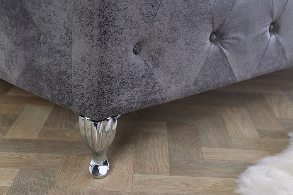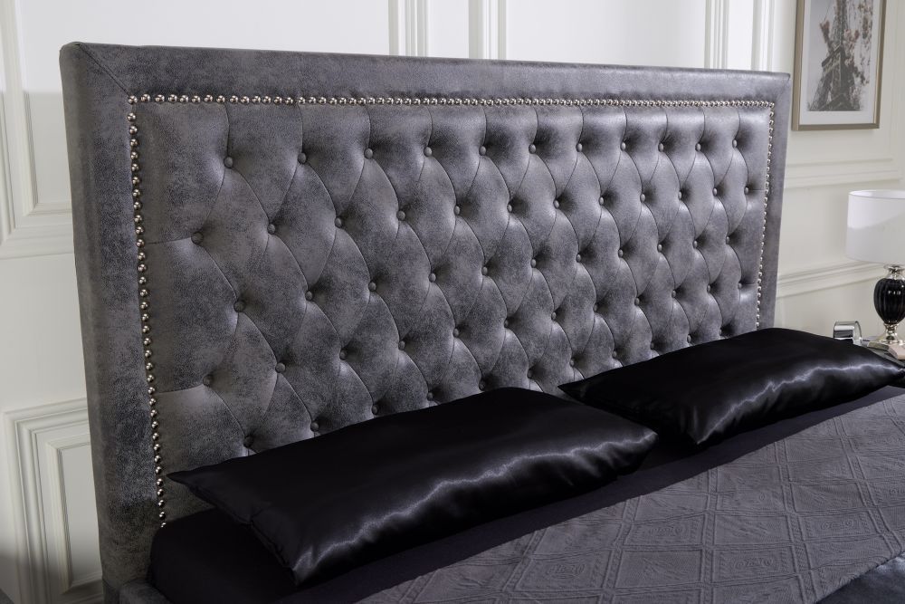Elegantan krevet, impresivnih dimenzija 190cm x 130cm x 215cm, odiše sofisticiranošću i luksuzom. Njegovo uzglavlje visoko 130cm, u kombinaciji s presvlakom u nijansi antik sive, pruža osjećaj topline i profinjenosti. Svojim srebrnim nogama, visine 14cm, krevet dodatno naglašava svoju kraljevsku prisutnost u prostoru, dok metalni elementi osiguravaju stabilnost i dugovječnost.