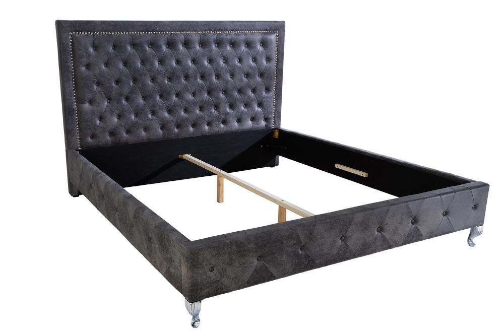 Izrađen od visokokvalitetnih materijala, uključujući MDF i mikrofibru, krevet nudi čvrstoću i udobnost. Presvlaka je izrađena od 100% poliestera, pružajući glatku i nježnu površinu koja poziva na opuštanje. Ovaj krevet, bez podnice i madraca, savršen je izbor za one koji žele kombinirati funkcionalnost s estetikom. Njegova predivna antik siva boja u harmoniji je s elegantnim dekorom, čineći ga središnjim dijelom svake spavaće sobe.