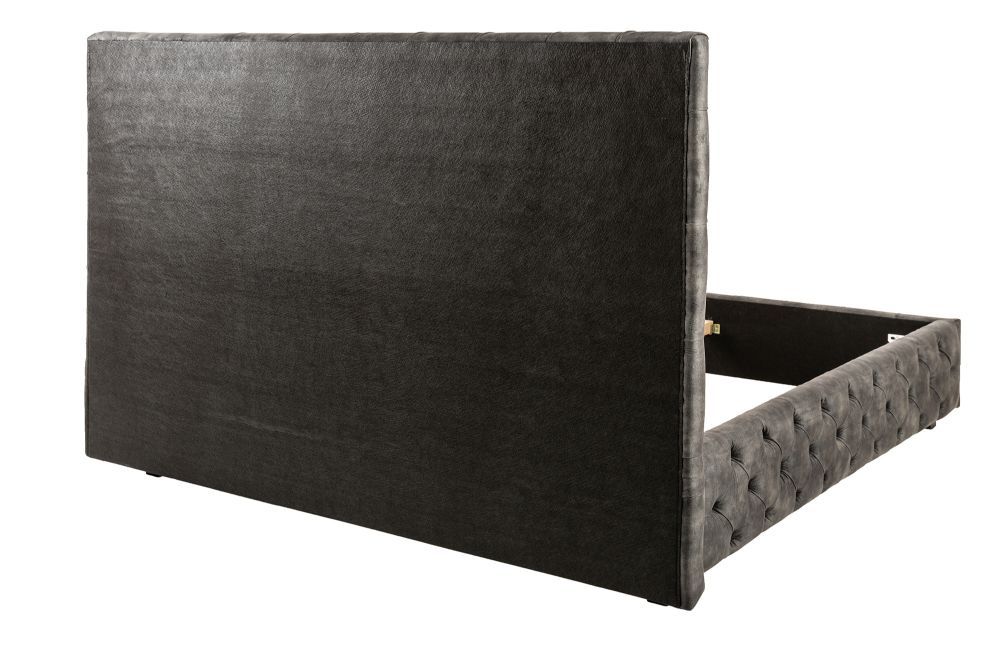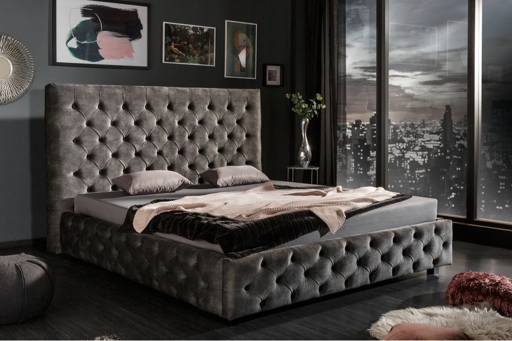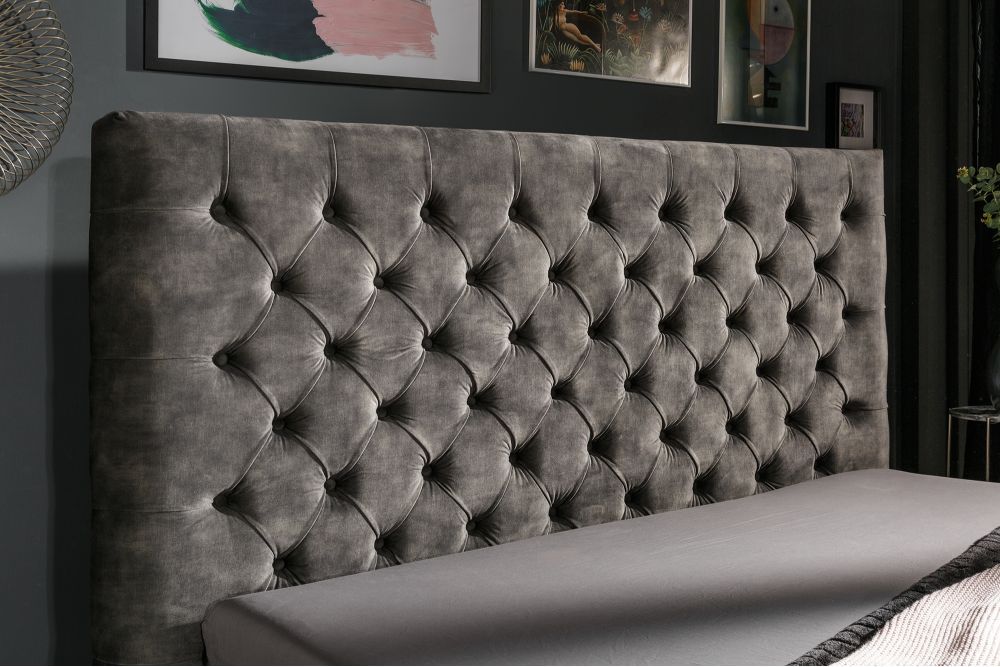 Elegantni krevet odiše bezvremenskim šarmom Chesterfield dizajna, s prepoznatljivim ukrasnim šavovima i profinjenim gumbima koji stvaraju bogatu teksturu na uzglavlju. Njegova čvrsta središnja šipka omogućuje postavljanje dviju podnica, pružajući stabilnost i dugotrajnu udobnost.