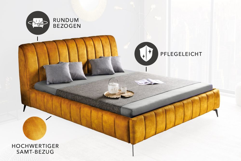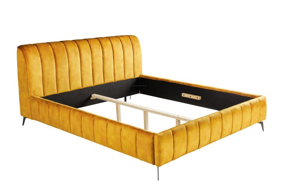 Krevet je presvučen strukturiranim baršunom u bogatoj senf žutoj boji, što mu daje dozu topline i luksuza, dok crne metalne noge s praškastim premazom dodaju industrijski šarm. Visina nogu od 14 cm i okvira od 56 cm pružaju čvrst, ali elegantan izgled, omogućujući jednostavno čišćenje ispod kreveta. Maksimalno opterećenje od 500 kg jamči izdržljivost i pouzdanost, čineći ga savršenim za svakodnevnu upotrebu.