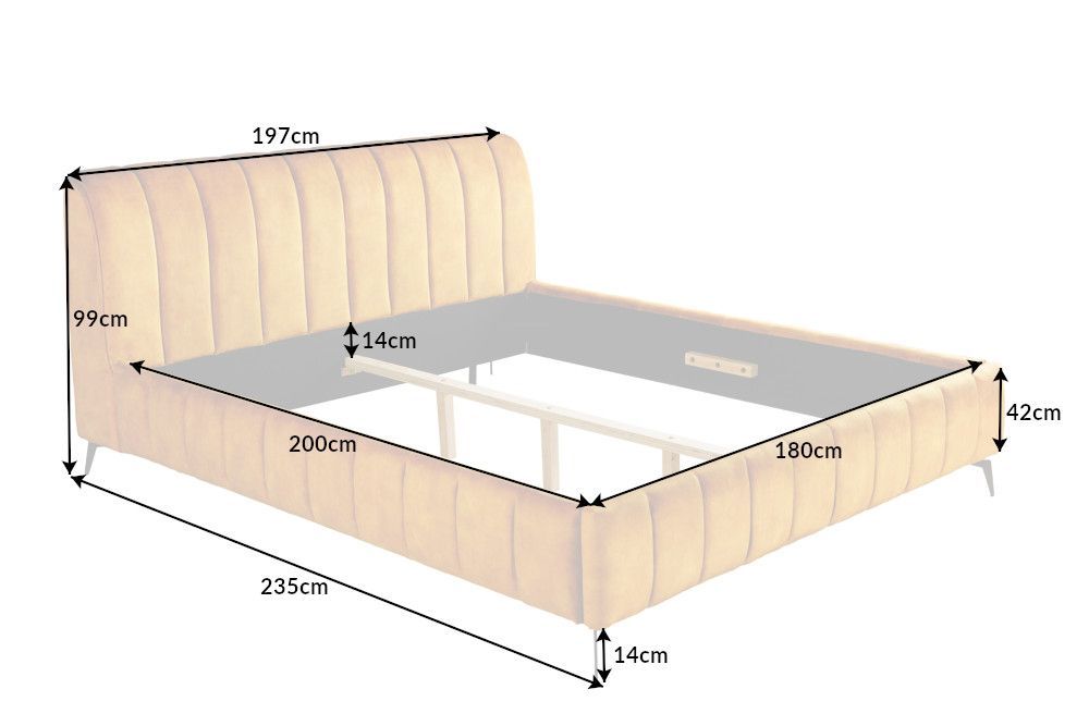 Krevet je savršen spoj funkcionalnosti i estetike, savršeno balansirajući udobnost i moderni dizajn. Dimenzije od 197 cm širine, 99 cm visine i 235 cm dubine čine ga impresivnim komadom namještaja, dizajniranim da bude središnja točka svakog suvremenog interijera. Površina za ležanje od 180 cm x 200 cm pruža izdašan prostor za odmor, dok dubina umetanja za podnicu od 14 cm i središnja greda omogućuju fleksibilnost u izboru podnica, osiguravajući stabilnost i dugovječnost.