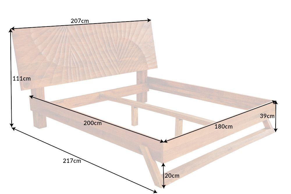 Krevet odražava prirodnu ljepotu i sofisticiranost zahvaljujući svojoj upadljivoj 3D površini koja je ručno rezbarena, donoseći osjećaj jedinstvenosti i umjetničke vještine. Izrađen od masivnog mangovog drva, koje je lakirano kako bi istaknulo toplu, smeđu boju drveta, ovaj krevet odiše prirodnim i rustikalnim šarmom.
