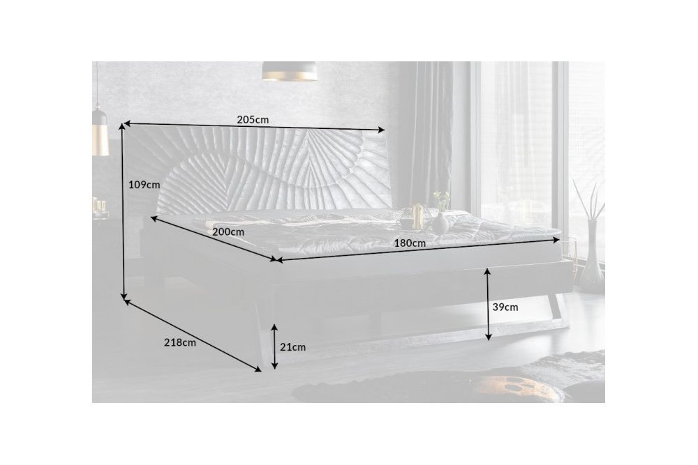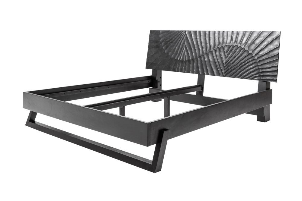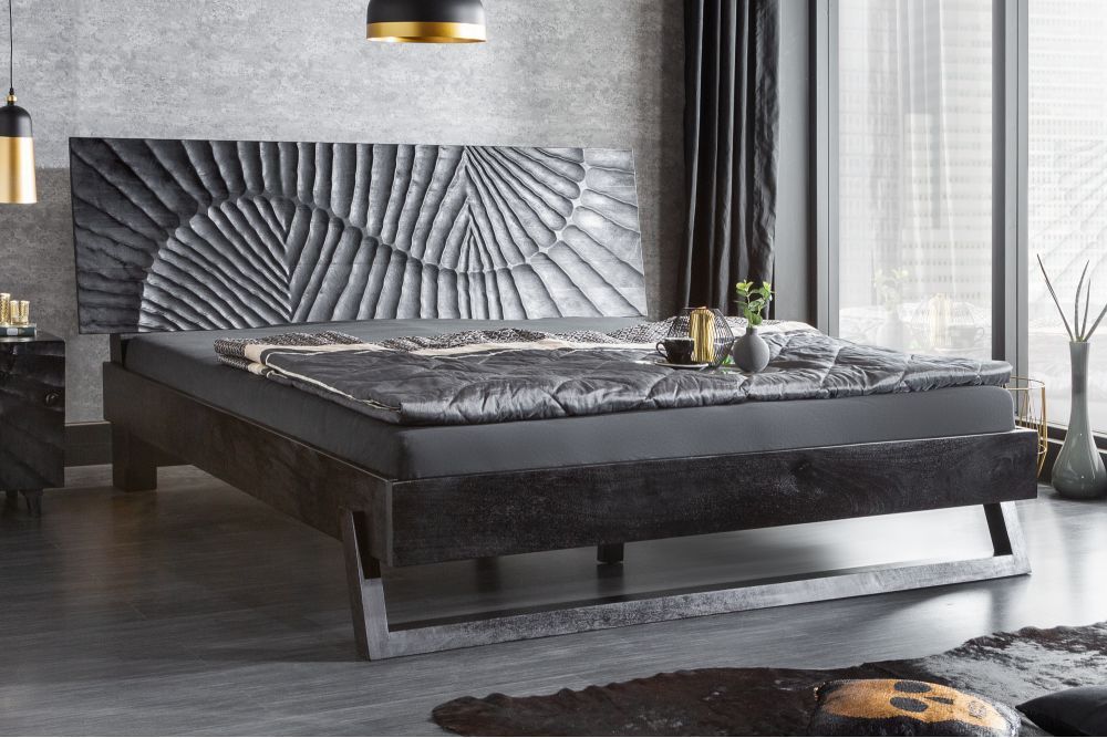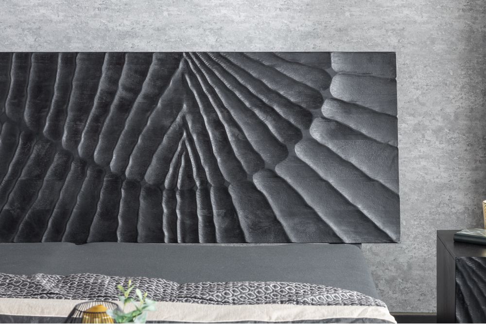 Krevet odiše sofisticiranom elegancijom, gdje su oblik i funkcionalnost spojeni u impresivan umjetnički komad. Njegova crna boja, u kontrastu s precizno izrezbarenim uzglavljem, daje osjećaj tajanstvenosti i dubine. Upadljiva 3D površina, pažljivo ručno rezbarena, kao da pulsira valovima i linijama koje prizivaju prirodne oblike poput kamenih formacija ili valova u pijesku, dok uzglavlje u visini od 109 cm dominira prostorom, stvarajući moćan vizualni efekt.