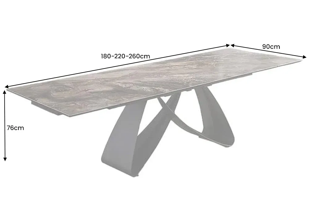 Spoj elegancije i funkcionalnosti dolazi u punom sjaju kroz ovaj impresivan stol s efektom svijetlog smeđeg mramora. Njegova ploča izrađena je od keramike na kaljenom staklu, debljine 13 mm, što mu daje profinjeni izgled prirodnog kamena uz visoku otpornost na svakodnevnu upotrebu. Nježne nijanse svijetlosmeđe s decentnim mramornim žilama unose sofisticiranost i lakoću, dok crno metalno postolje u ravnoj liniji dimenzija 0,5 x 40 cm dodaje moderan i stabilan kontrast. S duljinom koja se može proširiti od 180 do 260 cm, ovaj stol se lako prilagođava manjim i većim društvima, a širina od 90 cm pruža optimalan komfor. Visina od 76 cm i razmak od 75 cm do ruba stola omogućuju ugodno sjedenje uz stilsku postojanost. Savršen za suvremene interijere koji njeguju luksuz u toplim, prirodnim tonovima.