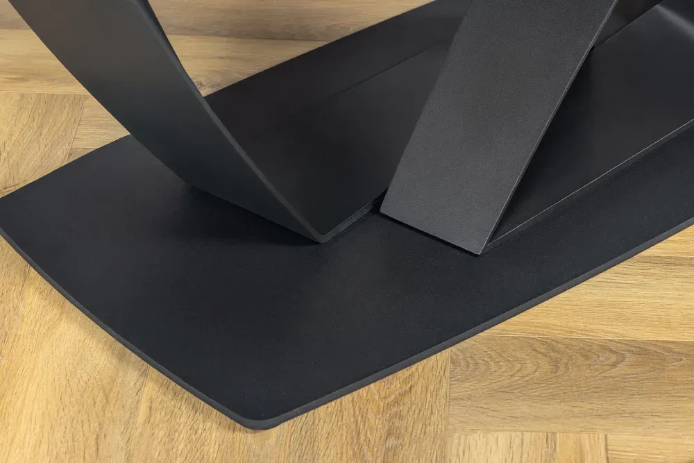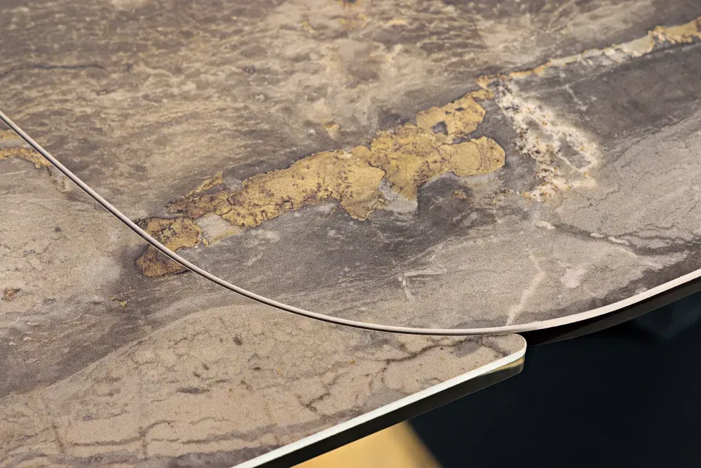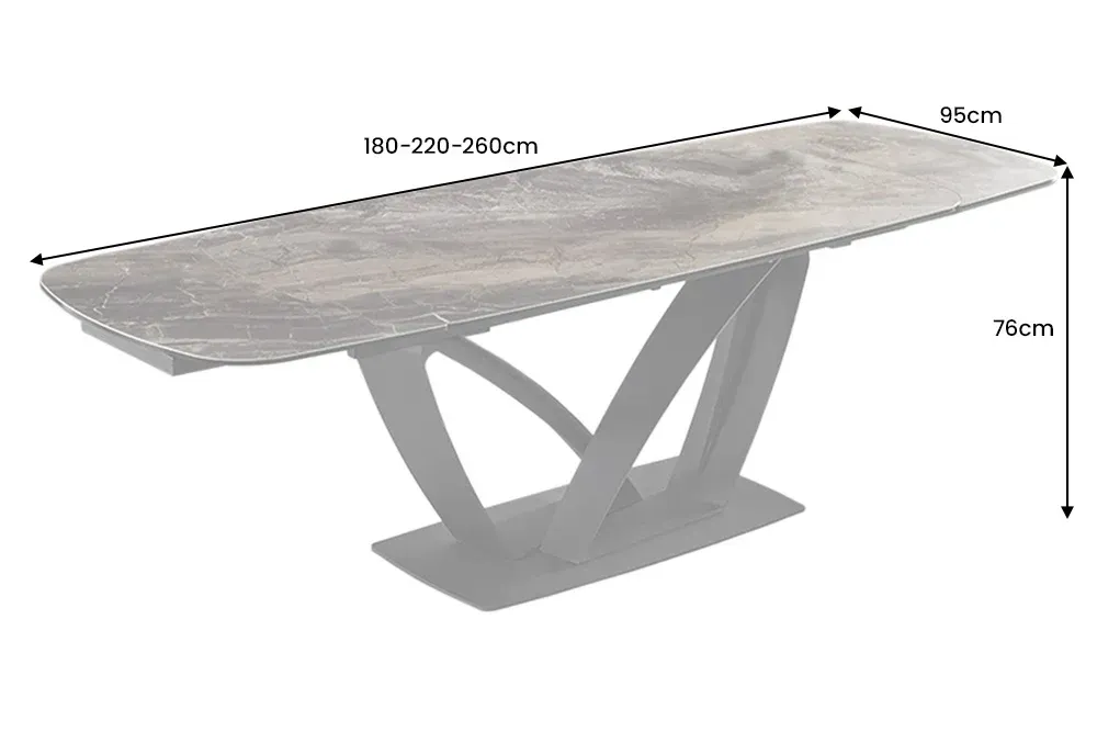 Spoj diskretne elegancije i modernog dizajna očituje se u ovom stolu s svijetlosmeđim mramornim efektom na ploči od keramike na kaljenom staklu. Debljine 13 mm, ploča odiše prirodnom toplinom i teksturom, dok crno postolje dimenzija 98 x 50 cm daje snažnu i stabilnu potporu. Širina od 95 cm osigurava prostranost za udobno sjedenje, a stol se produljuje od 180 do 260 cm kako bi zadovoljio potrebe različitih prigoda i broja gostiju. Visina od 76 cm i razmak od 75 cm do ruba stola omogućuju ergonomski ugodno sjedenje. Ovaj stol savršeno balansira između prirodnih tonova i suvremenih linija, pružajući luksuzan, a opet topao osjećaj u svakom prostoru.