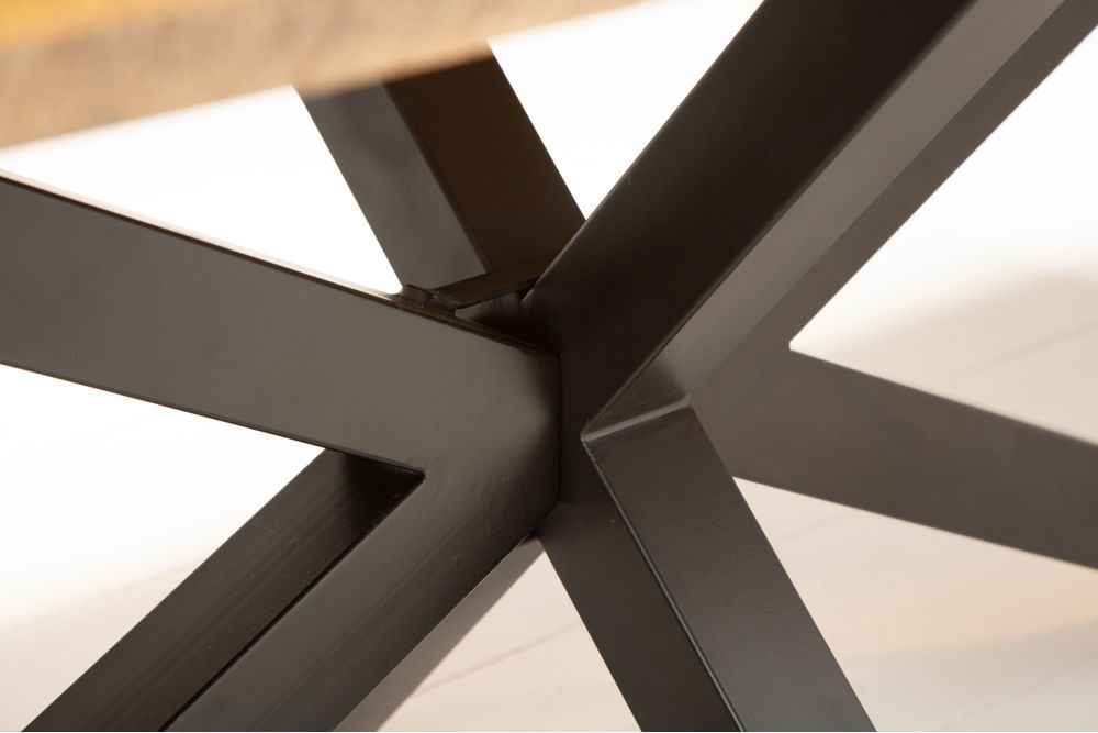 Čvrste, kvadratne noge stola (7,5 cm x 7,5 cm), izrađene od crnog metala s premazom u prahu, stvaraju skladan kontrast s prirodnom ljepotom drvene ploče. Okvir stola u obliku zvijezde savršeno upotpunjuje dizajn, dajući mu stabilnost, ali i estetsku privlačnost, podsjećajući na suptilni spoj industrijske estetike i organskih materijala.