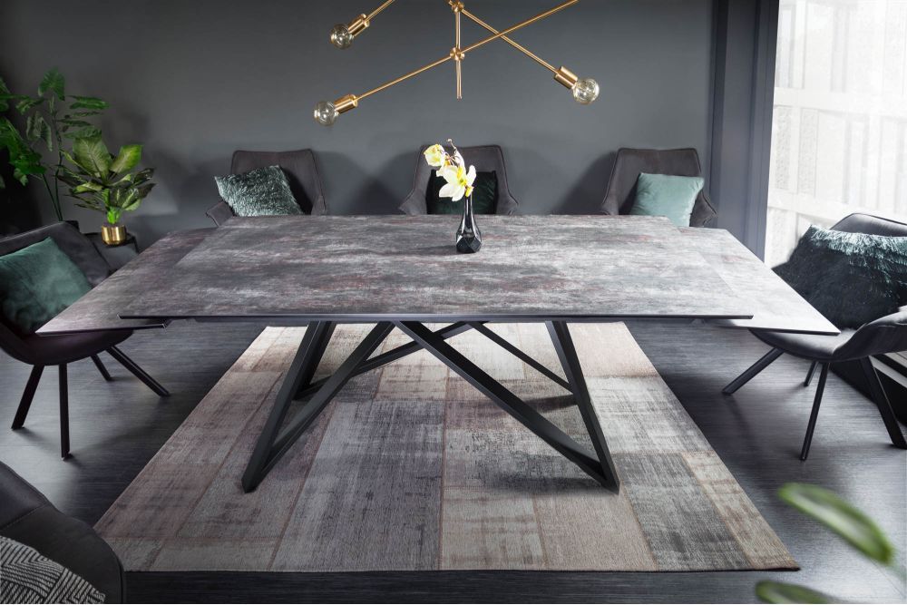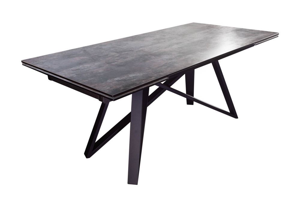 Stol na slici ima elegantan i moderan dizajn, s metalnim nogama u obliku geometrijskih crnih linija koje tvore križnu konstrukciju. Ploča stola je široka i ravna, s dimenzijama približno 180-220-260 cm u širini, 76 cm u visini i 90 cm u dubini, što mu daje impozantan, ali sofisticiran izgled. Površina stola je tamne, sivo-crne boje s efektom lave, što doprinosi luksuznom dojmu. Keramička ploča kombinirana sa sigurnosnim staklom daje dodatnu čvrstoću i otpornost, dok iznimno tanka staklena ploča debljine 13 mm održava moderan izgled.