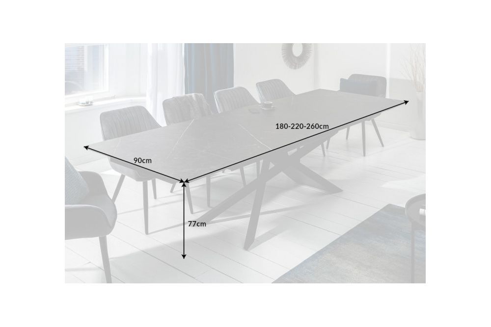 S veličinama koje variraju od 180 cm do impozantnih 260 cm, ovaj stol može se prilagoditi potrebama svakog doma. U tri faze proširenja, on se transformira, omogućujući ugodna okupljanja s obitelji i prijateljima, dok istovremeno zadržava minimalistički duh. Siva paleta boja, koja se kreće od elegantne sive do duboke crne, dodaje sofisticiranost, a u kombinaciji s metalnim okvirom premazanim prahom, stvorena je skladna cjelina koja oslikava industrijski stil.