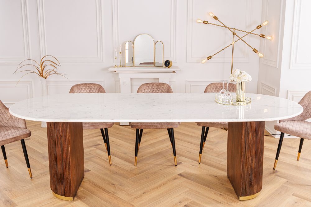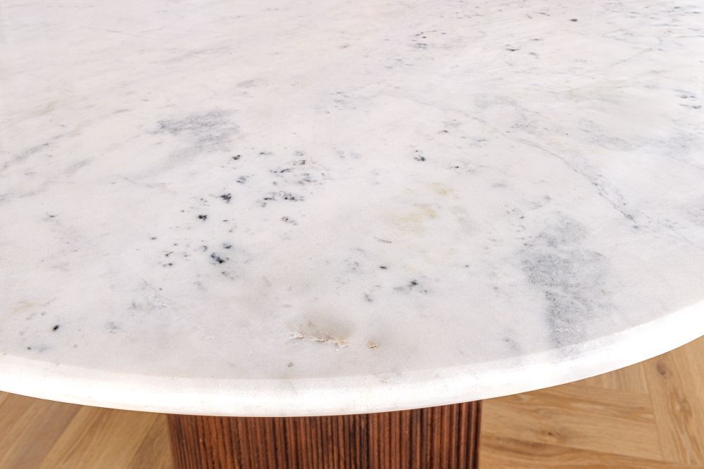 Ovaj stol odiše sofisticiranom elegancijom koja spaja suvremenost s vintage šarmom. Bijela mramorna ploča, s njezinom glatkom i čistom površinom, zrači luksuzom i jednostavnošću. U kontrastu, rebrasta drvena baza, izrađena od toplog mangovog drveta, donosi teksturalni element koji priziva doba retro dizajna. Suptilni detalji zlatnih akcenata na nogama stola i stolica dodaju dašak glamura, ističući bogatstvo prirodnih materijala. Ovaj stol savršeno balansira između snage masivnog drveta i prozračnosti mramora, stvarajući skladan komad namještaja koji odiše profinjenošću.