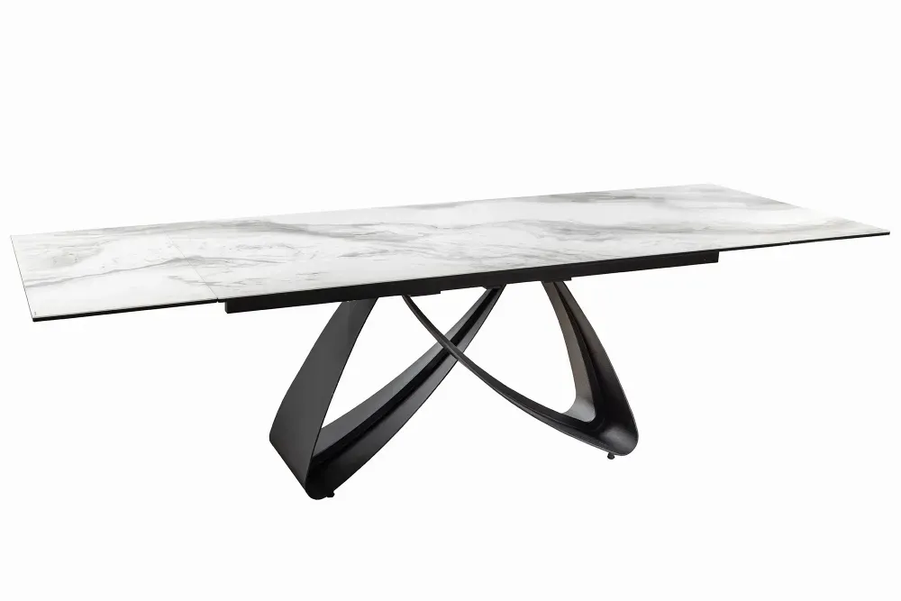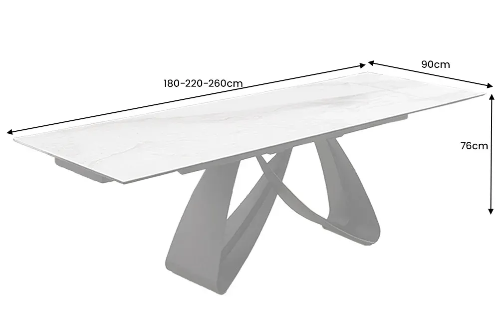 Ovaj stol odiše bezvremenskom elegancijom zahvaljujući svojoj ploči u bijelo-sivom mramornom izgledu, izrađenoj od keramike na kaljenom staklu. Bogata tekstura mramora unosi dojam luksuza i prozračnosti, dok crno metalno postolje ravnih linija stvara savršen kontrapunkt – moderan, stabilan i nenametljiv. Ploča debljine 13 mm (s 3 mm kaljenog stakla) nudi iznimnu izdržljivost i lako održavanje. S duljinom koja se može prilagoditi – 180, 220 ili čak 260 cm – ovaj stol savršen je za sve prilike, od svakodnevnih obroka do svečanih okupljanja. Širina od 90 cm te visina od 76 cm jamče prostranost i udobnost, dok razmak od 75 cm između poda i ruba stola omogućuje slobodno sjedenje. Ovaj komad savršeno kombinira sofisticiran dizajn i snažnu funkcionalnost.
