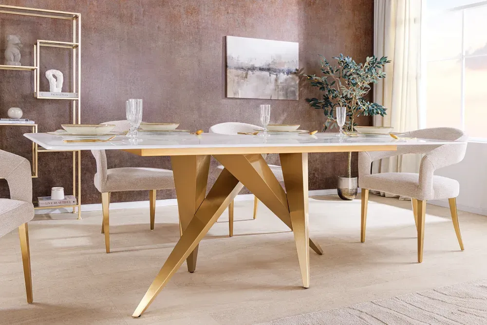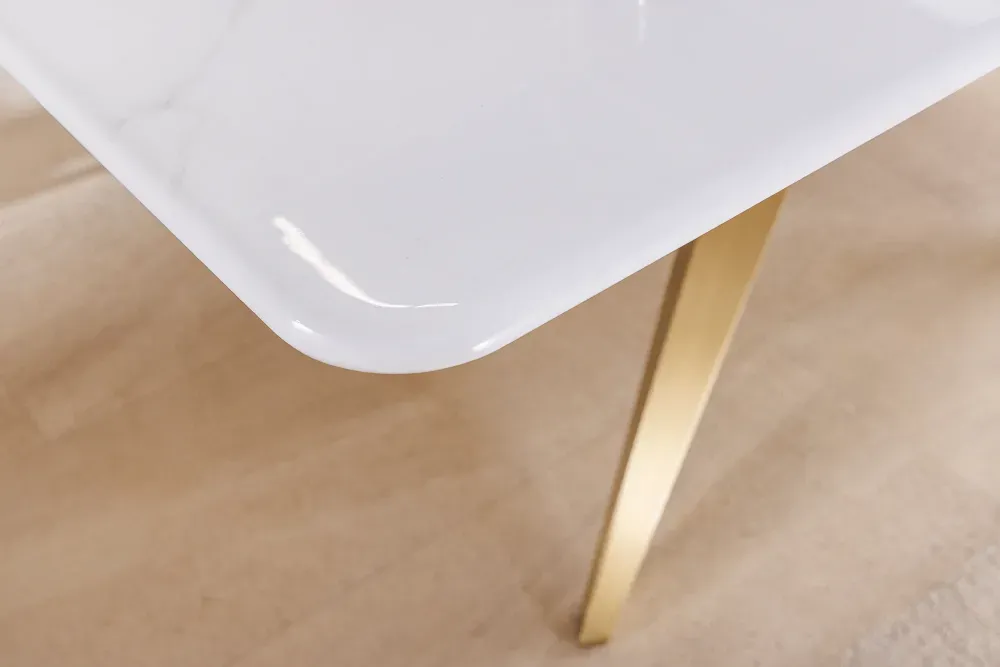 Ploča stola, od bijelog mramora s elegantnim, gotovo slikarskim žilama, sjaji kao površina mirnog jezera koje reflektira zoru. Sa samo 10 mm debljine, lebdi poput oblaka iznad zamršene geometrije zlatnog podnožja. A ipak, njezina snaga je bez sumnje — s nosivošću do 50 kg i preciznošću izrade koja se vidi u svakom centimetru.