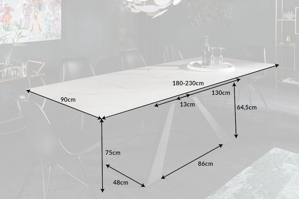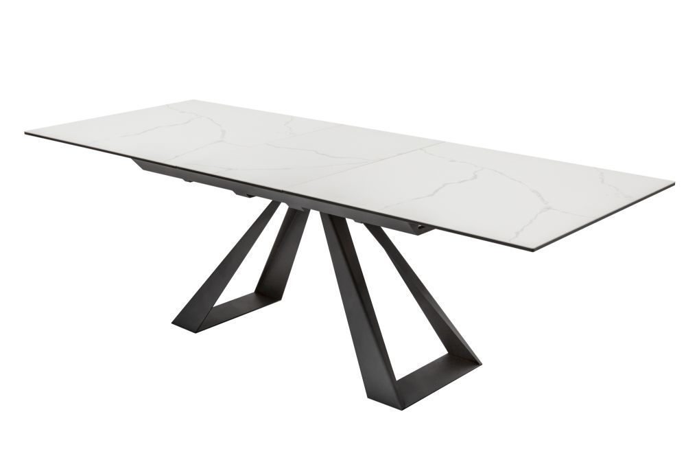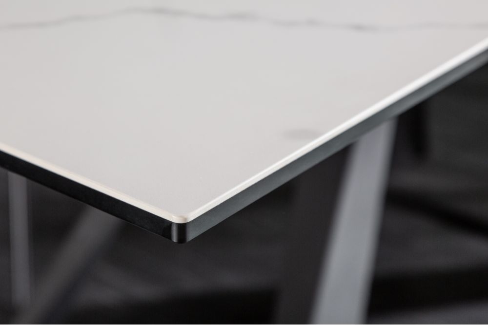 Na slici je prikazan moderan stol u industrijskom stilu. Ploča stola ima gladak, mat izgled u bijeloj boji, izrađena od keramike i sigurnosnog stakla, s debljinom od 13 mm, od čega je 10 mm staklo, a 3 mm keramička površina. Stol je opremljen produžnom pločom, koja omogućava da se njegova duljina poveća s 180 cm na 230 cm, što ga čini vrlo praktičnim za veća okupljanja.