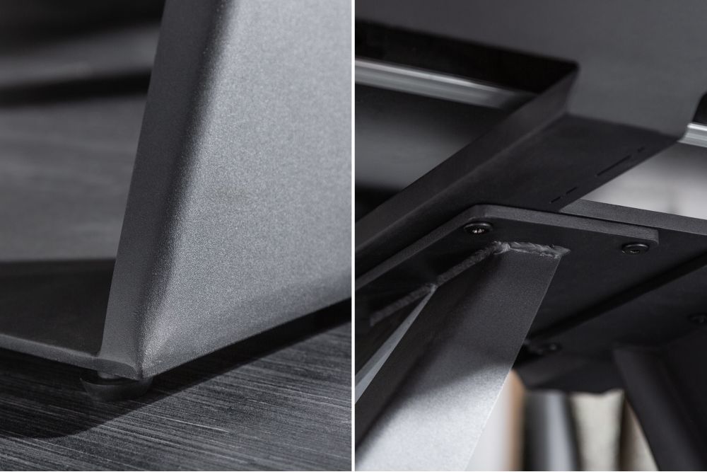Stol ima čvrstu metalnu bazu u crnoj boji s modernim, geometrijskim dizajnom. Metalna postolja su obložena premazom u prahu, što im daje dodatnu otpornost i industrijski izgled. Linije stola su oštre i čiste, s elegantnim nogama koje doprinose suvremenom, minimalističkom izgledu.