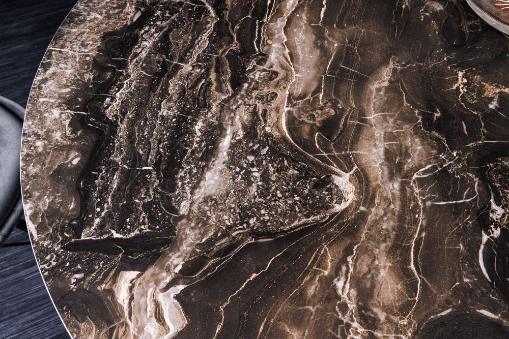 Ploča stola, u profinjenoj nijansi mješane sneđe i sive, donosi dozu sofisticiranosti i stila. Njezina glatka površina odražava svjetlost, stvarajući igru sjena i refleksija koja oživljava prostor oko nje. Keramika, kao materijal, ne samo da osigurava lakoću održavanja, već i donosi osjećaj hladnoće i svježine, idealan za dinamične kuhinjske ambijente gdje se često okupljaju obitelj i prijatelji.