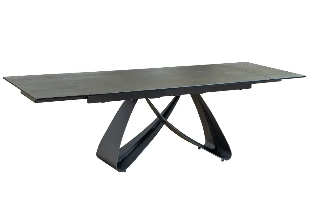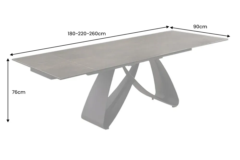 Ovaj stol u izgledu hrđe (rostoptik) spaja sirovu industrijsku estetiku s visokom sofisticiranošću suvremenog dizajna. Površina stola izrađena je od keramike na kaljenom staklu, debljine 13 mm, pružajući izvanrednu otpornost i vizualni dojam teksture metala izloženog vremenu. Crno metalno postolje u elegantnoj liniji dimenzija 0,5 x 40 cm osigurava stabilnost uz minimalizam u formi. S impresivnom širinom od 90 cm i duljinom koja se može prilagoditi od 180 do čak 260 cm, ovaj stol se lako transformira iz svakodnevice u prostor za velika okupljanja. Njegova visina od 76 cm i razmak od 75 cm do ruba stola osiguravaju udobno sjedenje, dok maksimalna nosivost od 60 kg potvrđuje funkcionalnu čvrstoću. Masivan i izražajan, ovaj komad dominira prostorom – kao komad skulpture s uporabnom svrhom.