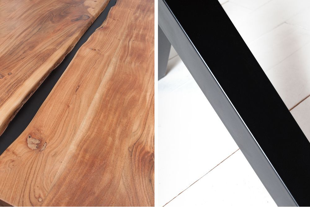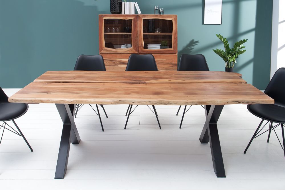 Kuhinjski stol koji ima dimenzije približno 200 cm x 75 cm x 98 cm (ŠxVxD). Stol je napravljen od masivnog drva, konkretno bagrema, te je zapečaćen i lakiran kako bi mu se osigurala izdržljivost i estetski sjaj. Ploča stola je debele strukture, s vanjskom debljinom od 38 mm, i u prirodnoj je boji koja naglašava teksturu i šare drva. Vidljivo je da se radi o ručno izrađenom proizvodu, što potvrđuju nepravilni, prirodni rubovi ploče stola, kao i eventualne neravnine koje doprinose njegovom unikatnom izgledu. Također, središnji dio ploče ima nepravilnu pukotinu koja stolu daje dodatnu autentičnost.