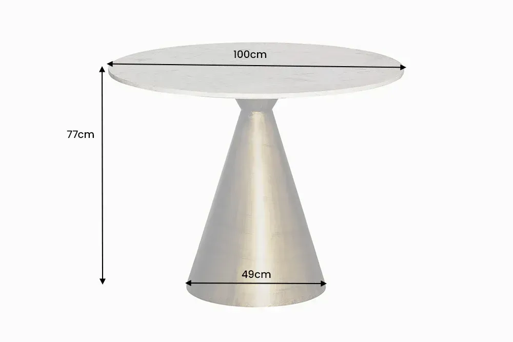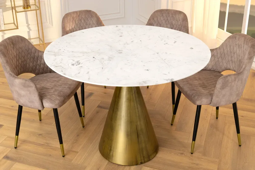 Stol koji spaja klasiku i luksuz u savršenoj harmoniji. Okrugla bijela mramorna ploča odiše profinjenošću, dok konusno postolje u zlatnoj mesinganoj boji dodaje dašak glamura. Ručno izrađen s pažnjom na detalje – ovo je središnji komad za prostore koji teže stilu, ali i bezvremenskoj eleganciji.
