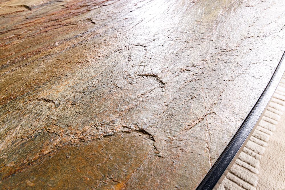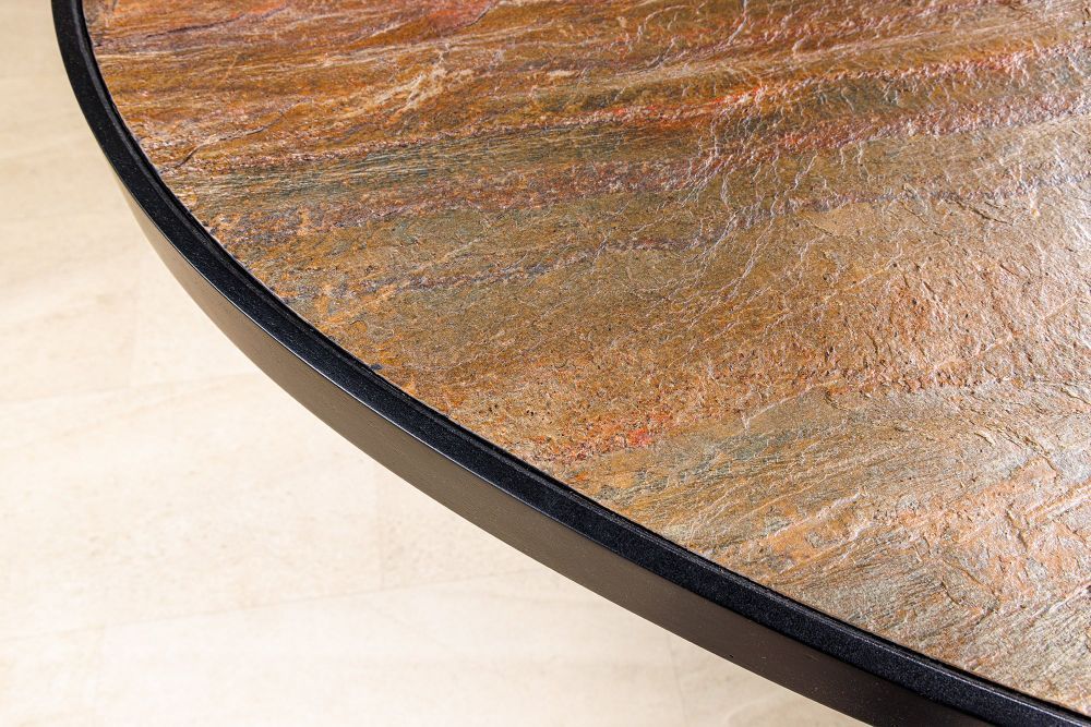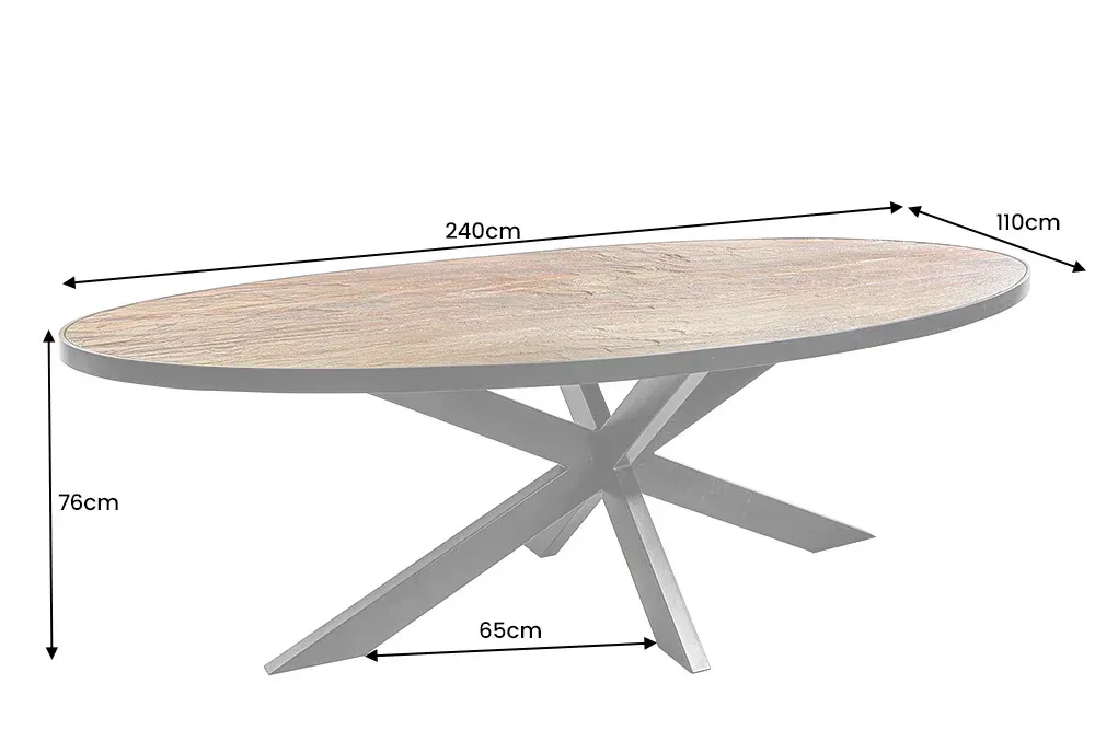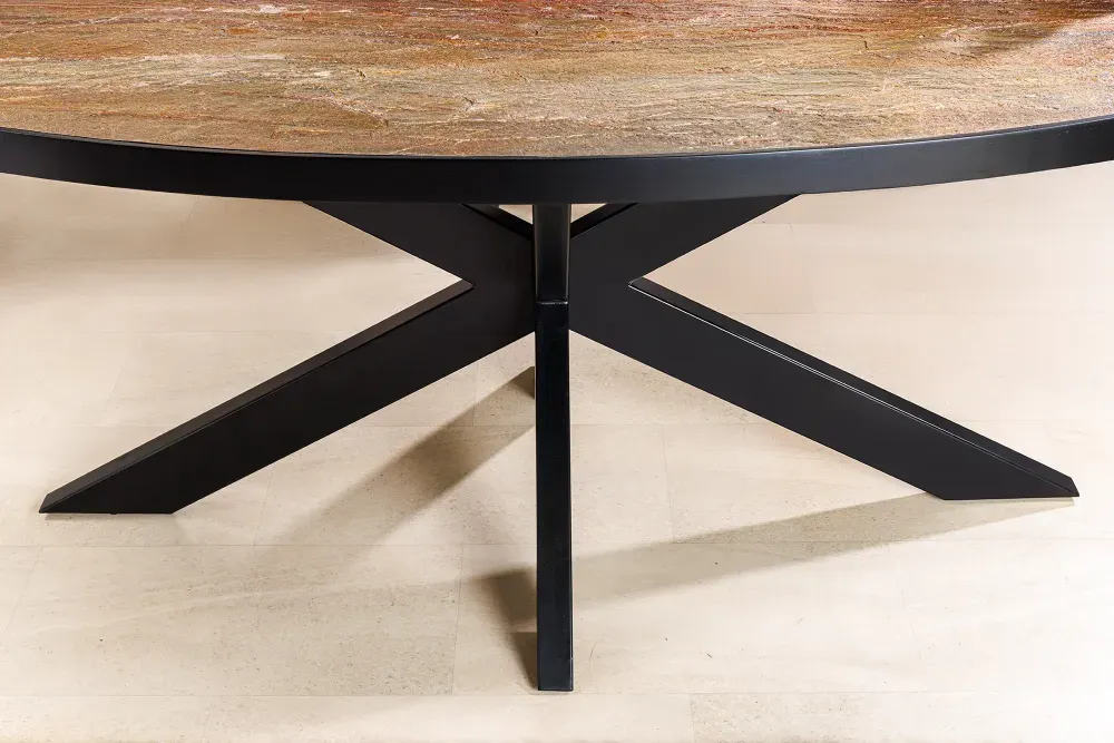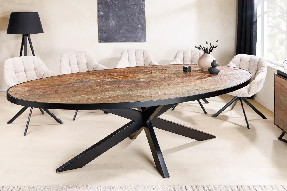 Ovaj impozantni ovalni stol donosi prirodni šarm kamena u sofisticiranom obliku. Površina u efektu prirodnog kamena odiše dubinom i nijansiranom toplinom, a crno metalno postolje unosi stabilnost i suvremenu eleganciju.