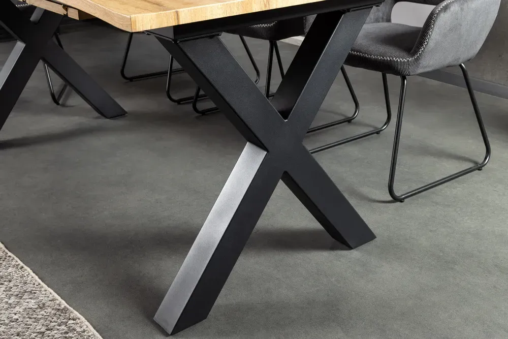 Ovaj stol spaja rustikalnu toplinu drveta s industrijskim šarmom. Izrađen od kvalitetnog drvnog materijala u prirodnoj boji, s pločom koja zadržava autentičan izgled prirodne ivice. Crne metalne X-noge dodaju čvrstoću i stil. Zahvaljujući funkciji proširenja, stol se jednostavno prilagođava različitim prilikama – savršen za svakodnevne obroke, ali i velika okupljanja.