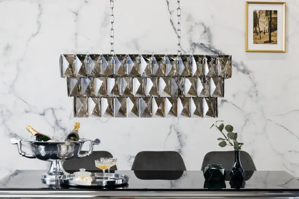 Ovaj elegantni luster u kombinaciji stakla i metala unosi sofisticiranost i moderni šarm u svaki prostor. S njegovim prefinjenim dizajnom, savršeno se uklapa u različite stilove interijera, unoseći profinjenost i sofisticiranost.