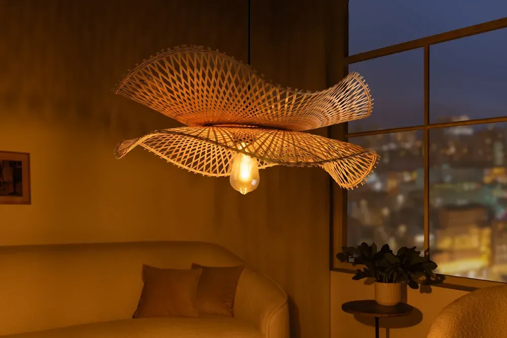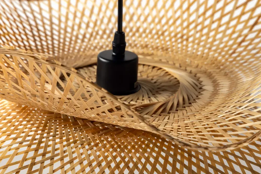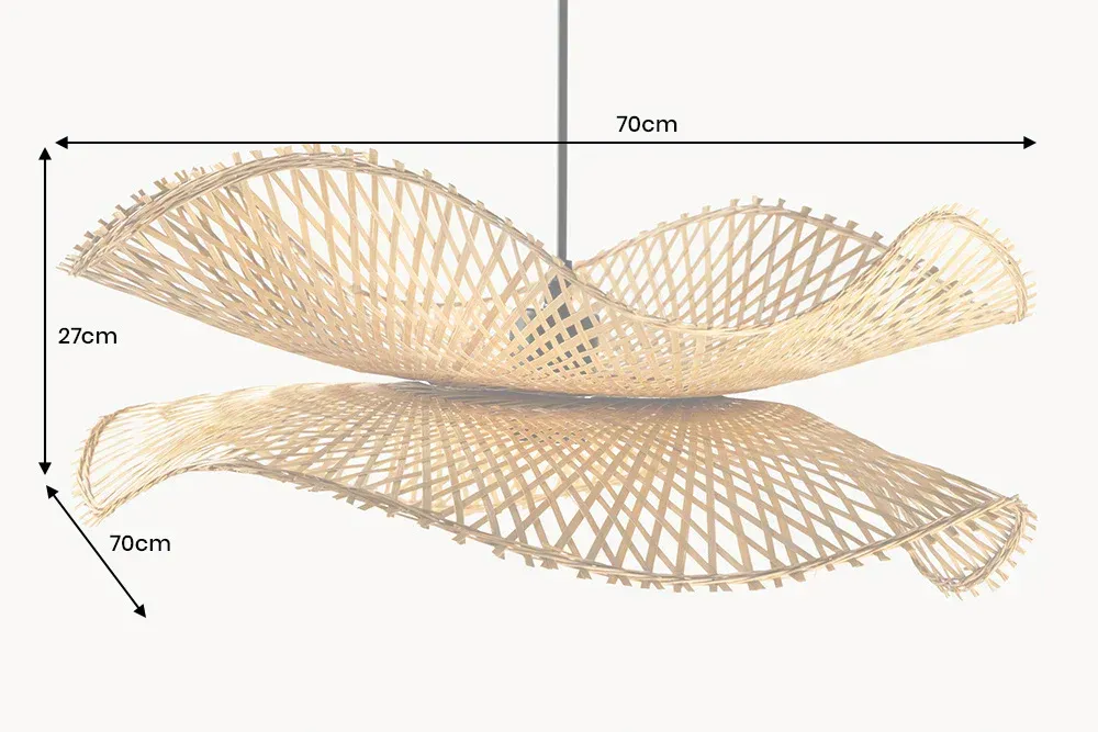 Ova ručno izrađena viseća lampa od bambusa unosi prirodnu ljepotu i toplinu u svaki prostor. Svojim prozračnim dizajnom omogućuje ugodno raspršivanje svjetlosti, stvarajući opuštajuću atmosferu idealnu za dnevni boravak, blagovaonicu ili spavaću sobu.