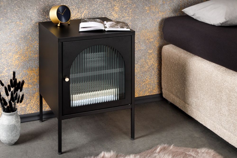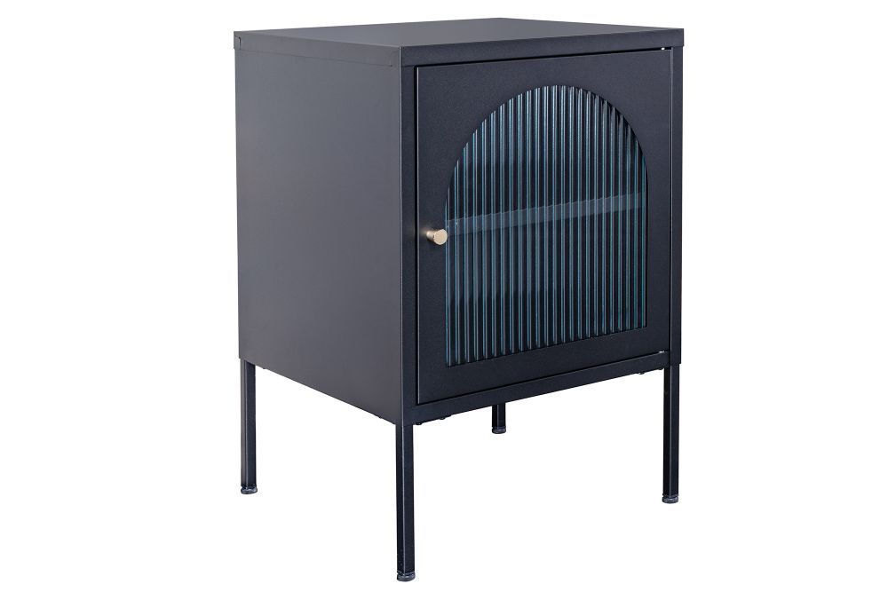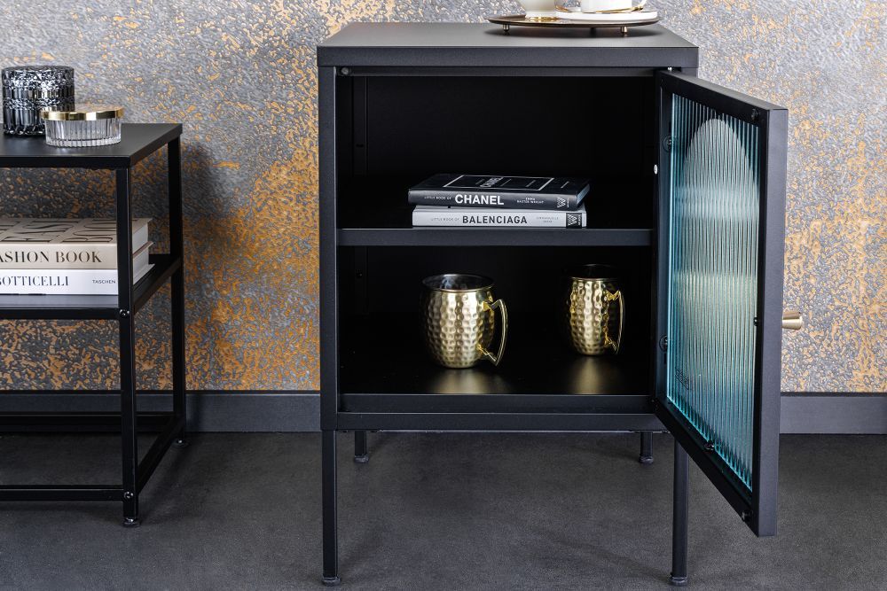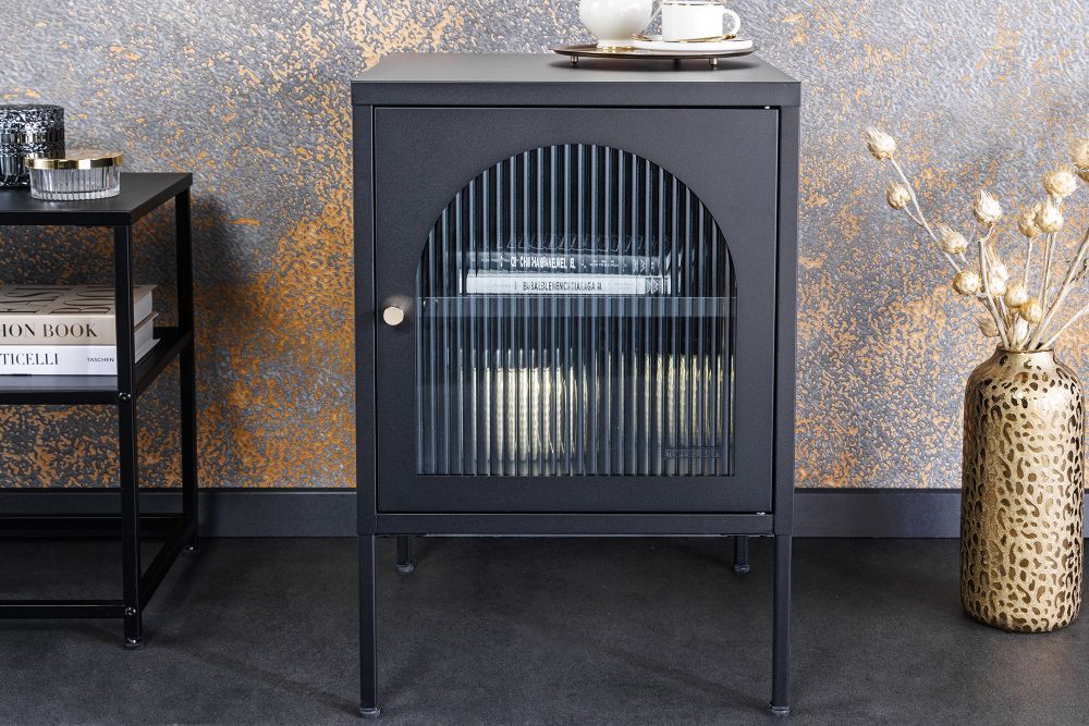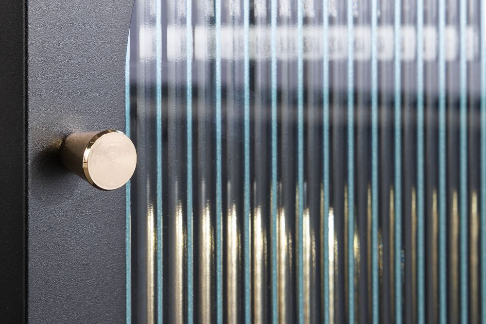 Crno lakirano čelično kućište, s tankim i graciozno dizajniranim nogama, odiše diskretnom moći. Njegova vrata, izrađena od rebrastog sigurnosnog stakla, unose dašak mističnosti, skrivajući sadržaj unutar, dok svjetlost nježno prodire kroz teksturu stakla, stvarajući intrigantne igre svjetla i sjene. Zlatna metalna ručka dodaje suptilan luksuzan detalj, savršeno kontrastirajući crnom tijelu ormarića.