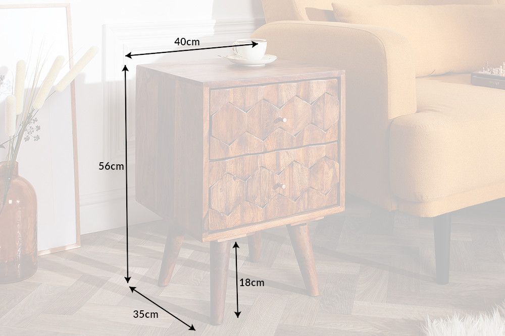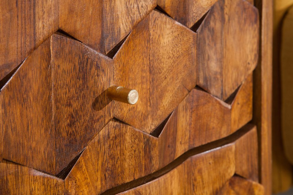 Noćni ormarić odiše elegancijom i prirodnom ljepotom, izrađen od masivnog sheesham drveta koje svojom jedinstvenom i uzbudljivom strukturom priča priču o dalekim, egzotičnim šumama. Upadljiv 3D dizajn prednje površine, ekstravagantan i odvažan, poput slagalice satkane od drvenih oblika, neizbježno privlači poglede i čini ga središnjim dijelom prostora.