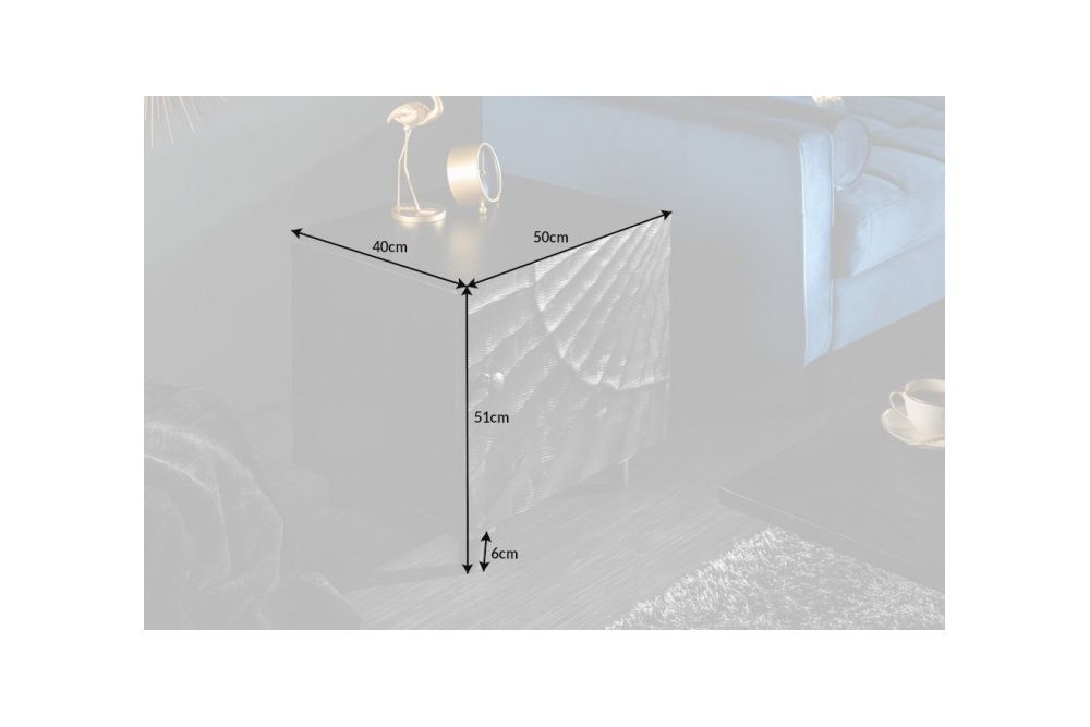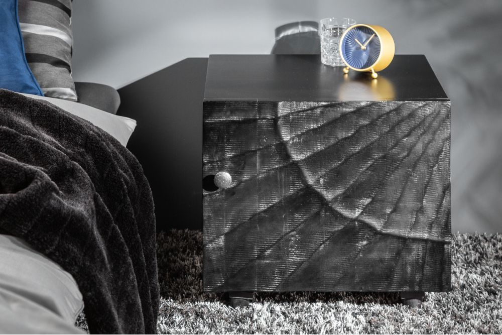 Noćni ormarić izrađen od masivnog mango drveta zrači toplinom prirodnog materijala, a površinske 3D-rezbarije ručno su oblikovane s takvom pažnjom da stvaraju igru svjetla i sjene koja očarava svaki pogled. Crni tonovi drveta naglašeni su lakiranom završnicom koja ističe zrnatu strukturu, dok su drvene noge, visoke 5 cm, diskretno podignute kako bi stvorile osjećaj lebdenja iznad poda.