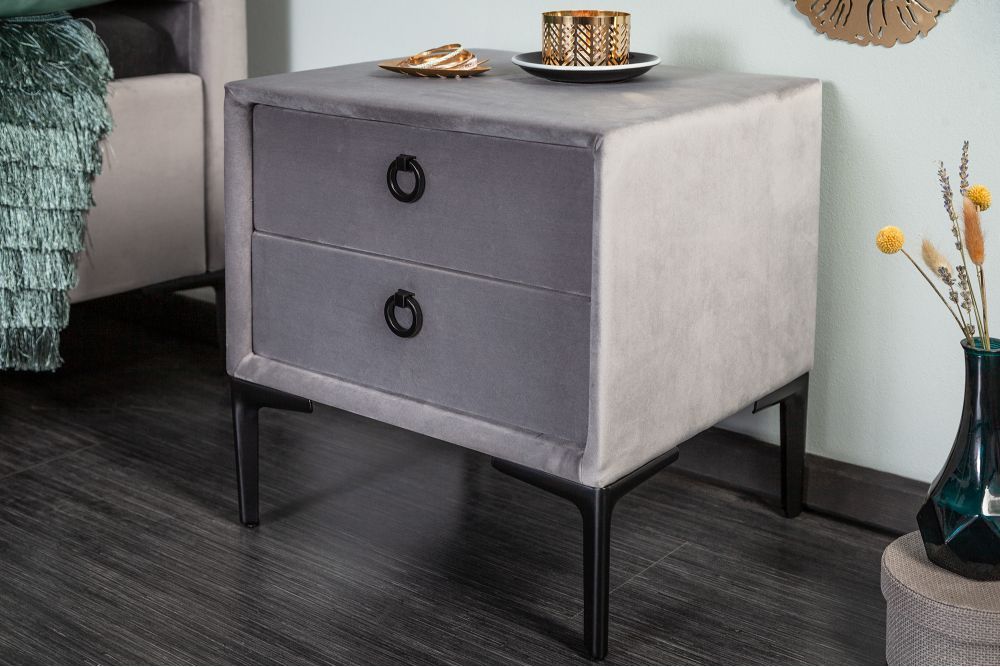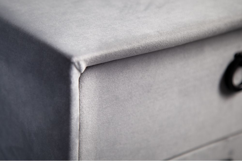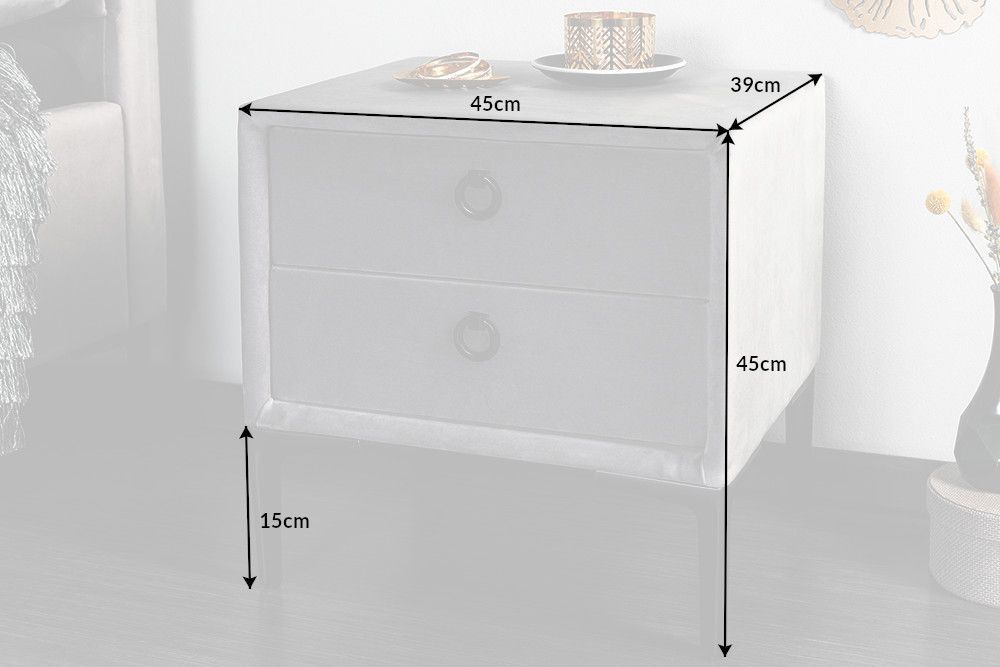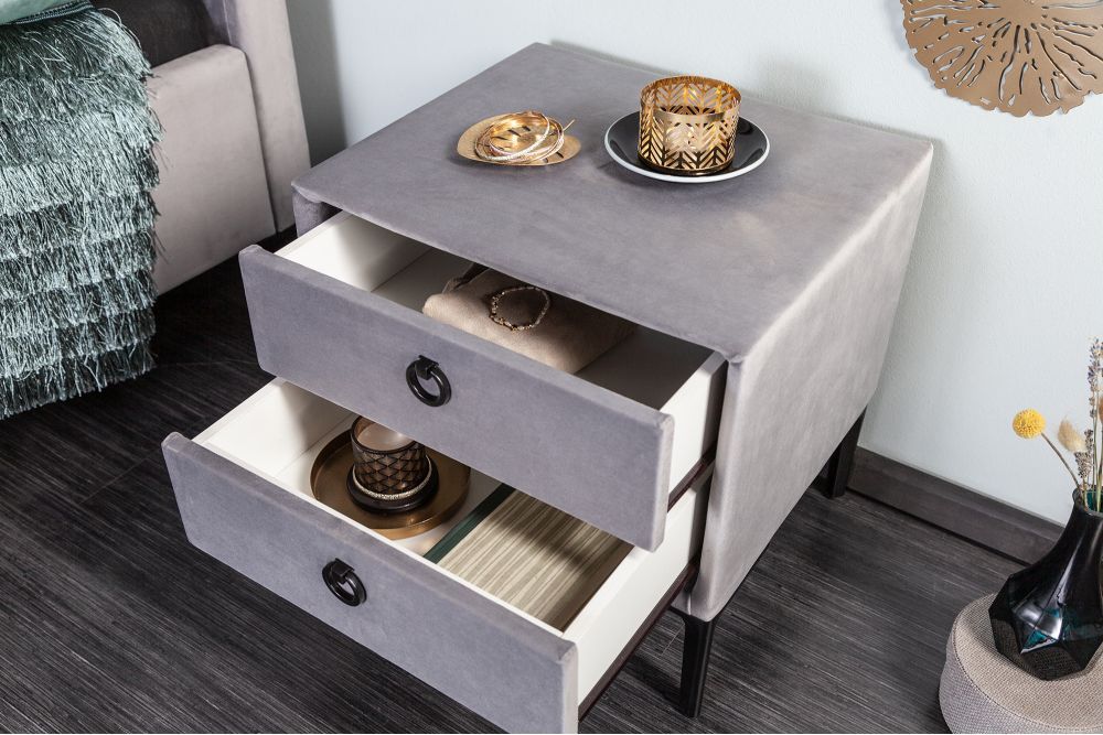 Elegantno dizajniran noćni ormarić, presvučen baršunastim srebrno-sivim materijalom, odiše sofisticiranim luksuzom i udobnošću. Njegove čiste linije i jednostavna, ali moderna forma savršeno se uklapaju u svaki interijer, unoseći suptilan dašak elegancije. Dvije prostrane ladice, dimenzija 36 cm x 9 cm x 27 cm, pružaju dovoljno prostora za pohranu osobnih predmeta, dok crne metalne ručke u obliku prstena dodaju dozu profinjenosti.
