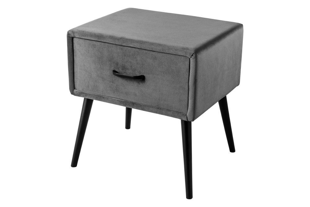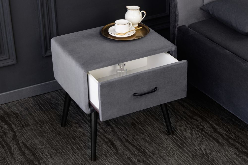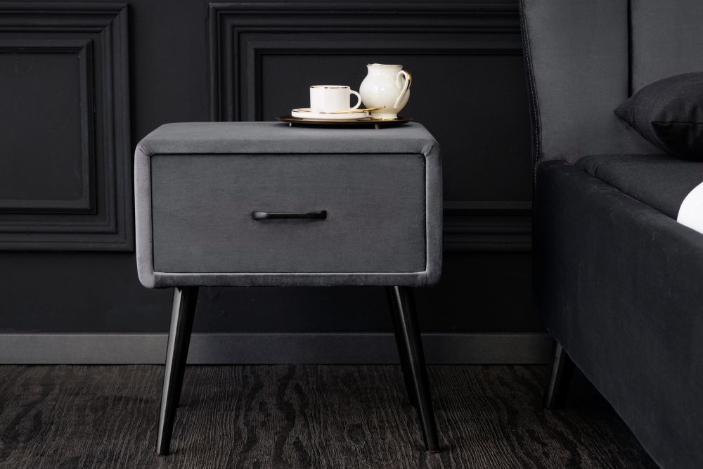 Noćni ormarić koji u sebi nosi eleganciju i profinjenost modernog dizajna. Njegova dimenzija, skladno uklopljena u prostor (45 cm širine, 47 cm visine, i 36 cm dubine), čini ga kompaktnim, ali istovremeno dominantnim elementom sobe. Baršunasta presvlaka u nijansi sofisticirane sive pruža mekoću i vizualnu toplinu, dok nježan sjaj tkanine stvara suptilan kontrast s tamnim, drvenim elementima okvira.