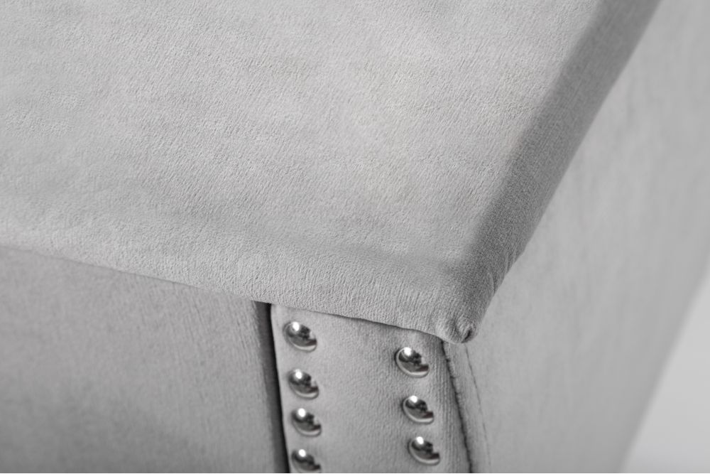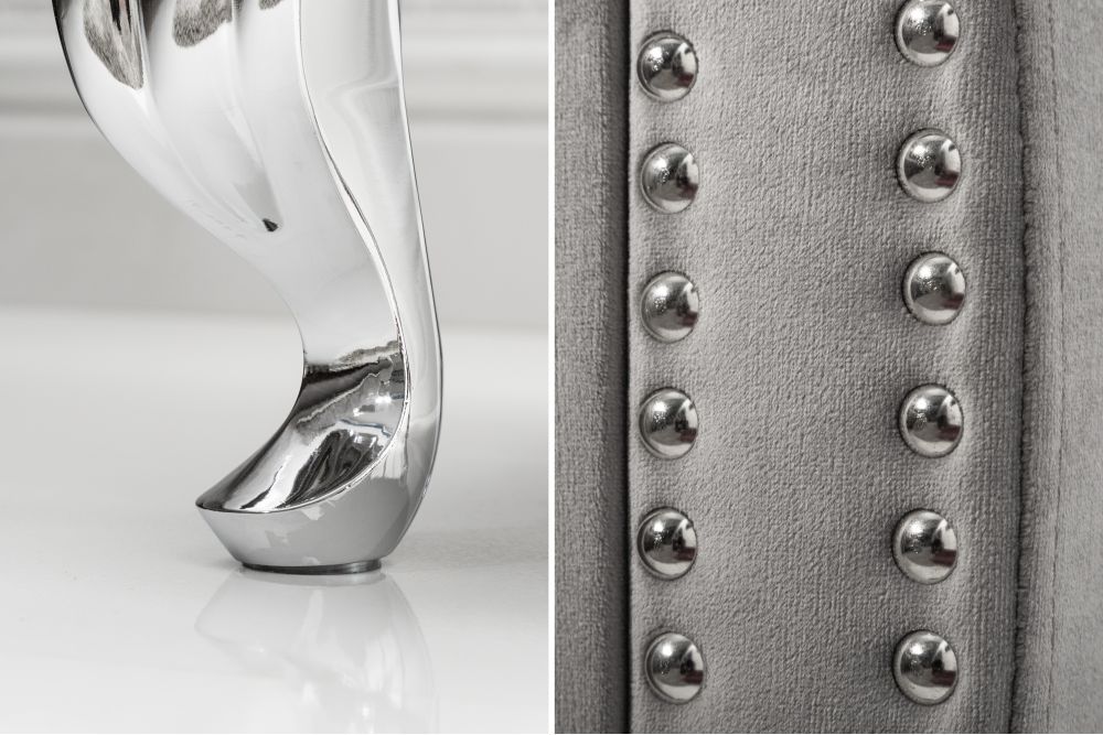 Noge ormarića, izrađene od srebrnog metala, odišu baroknim stilom. Njihova blaga zakrivljenost dodaje osjećaj gracioznosti, podižući ormarić 14 cm iznad tla, kao da lebdi iznad površine na kojoj počiva. Kombinacija srebrnog tona nogu i korpusa stvara savršen balans između hladnog metala i toplog, baršunastog tekstila.