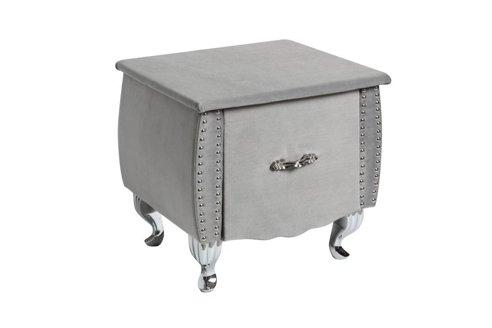 Noćni ormarić čija elegancija zrači sofisticiranošću i raskoši. Njegov korpus u srebrno-sivoj nijansi, presvučen mekim baršunom od 100% poliestera, odiše profinjenošću i delikatnošću, privlačeći pogled svojom suptilnom, ali raskošnom teksturom. Oblik ormarića je blago zaobljen, nalik na komad namještaja iz nekog starog, aristokratskog salona, gdje se susreću klasični i moderni stil.