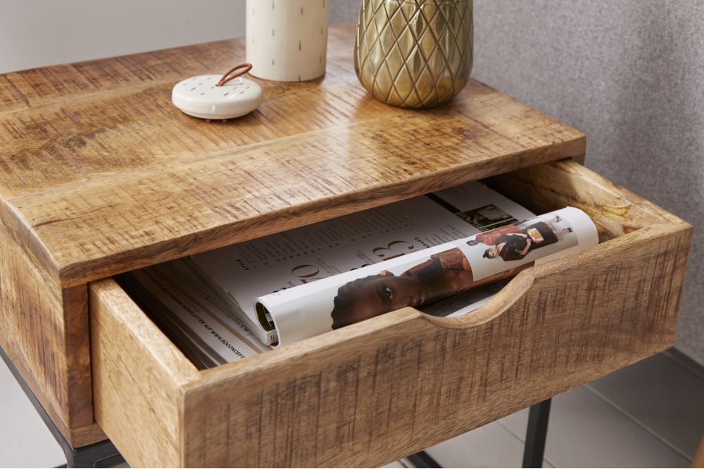 Njegova estetika industrijskog stila odražava kombinaciju sirovih materijala i čistih linija, savršeno uklapajući ovaj noćni ormarić u prostorije inspirirane modernim i vintage dizajnom.