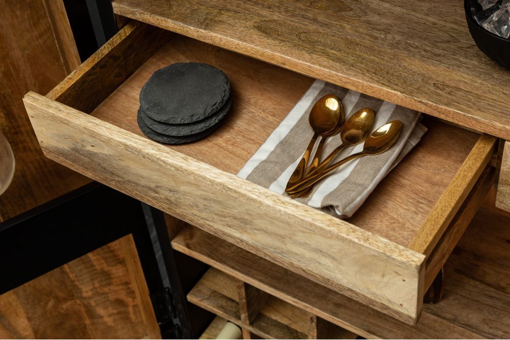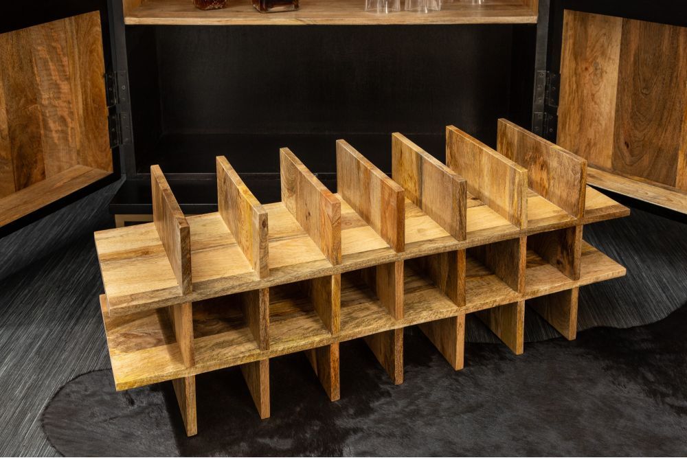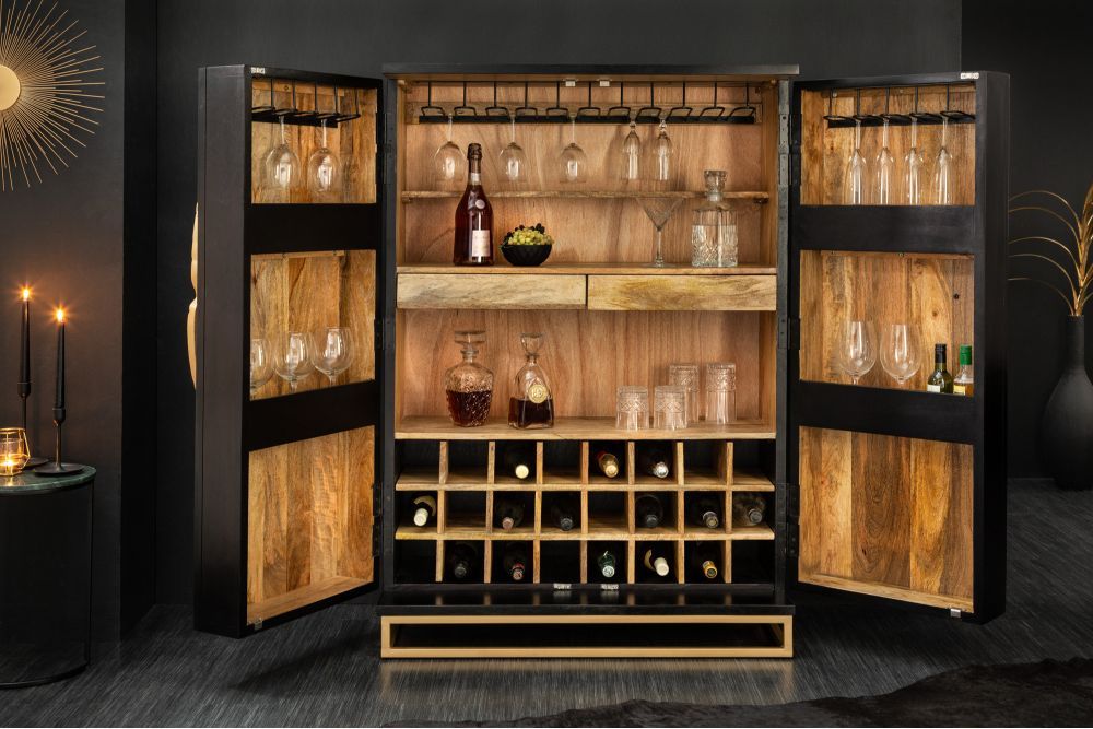 Ormar visok 140 cm i širok 95 cm, izrađen od lakiranog drva manga, nosi u sebi suptilnu toplinu prirodnog materijala, dok zlatne metalne noge podižu cijelu konstrukciju, dodajući modernističku notu. Unutrašnjost, koja otkriva prostrane police i elegantno postavljene pretince za čaše i boce, poziva na luksuzno iskustvo, bilo da se radi o pohrani vina ili prezentaciji finih kristalnih čaša.