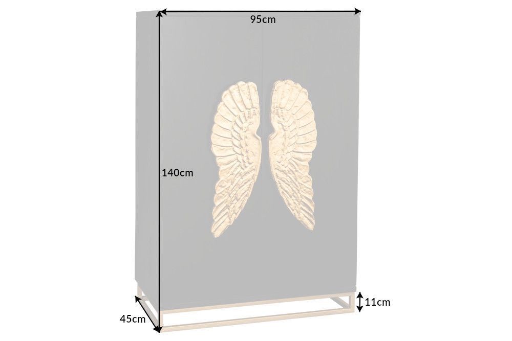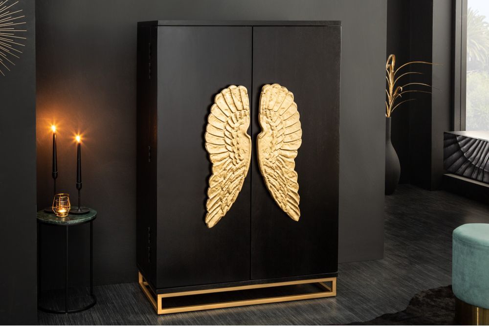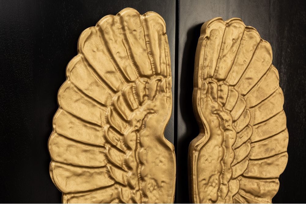 Ovaj impresivni ormarić odiše elegancijom i dramatičnošću, pretvarajući funkcionalan komad namještaja u umjetničko djelo. Središnji element su raskošne zlatne ručke u obliku krila, koje podsjećaju na mitološke anđele ili simbole slobode. Njihov nježan, ali moćan dizajn u kontrastu je s tamnom, crnom površinom ormarića, stvarajući vizualni balans.