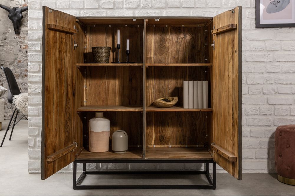 Izrađen od masivnog drva akacije, ovaj komad namještaja donosi toplinu i prirodnu ljepotu u vaš dom. Lakirana površina naglašava bogatu teksturu drva, dok su metalne noge čvrste i elegantne, podižući ormarić na visinu od 20 cm.